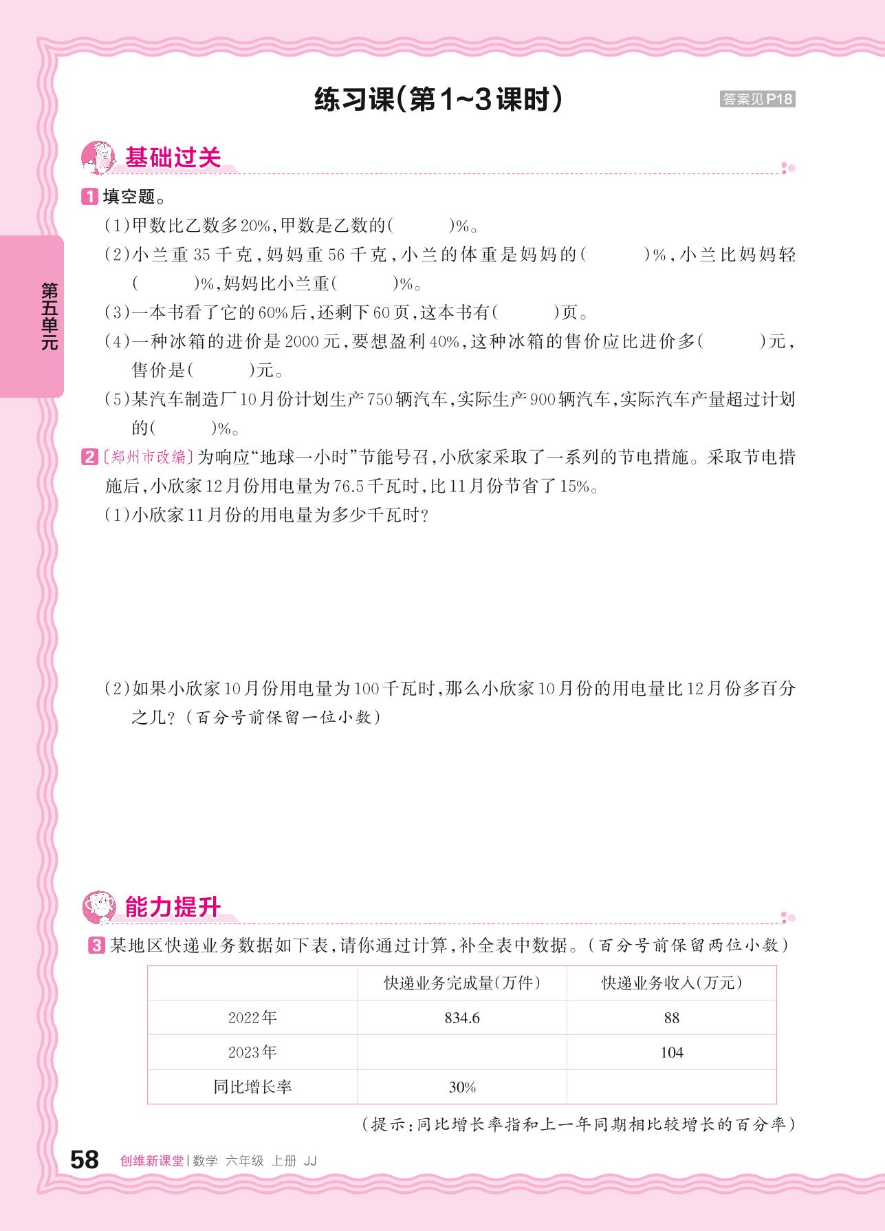 2024秋上册六年级数学冀教版 第五单元 百分数的应用——求百分数的问题、求具体数量的问题、新闻中的问题练习课