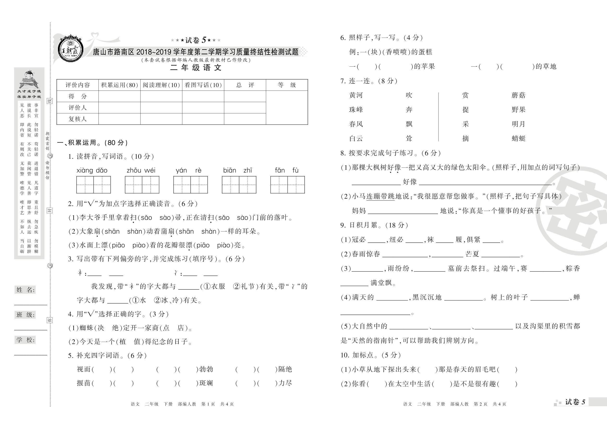 2018-2019学年第二学期唐山市路南区二年级语文试卷(人教版)【5】