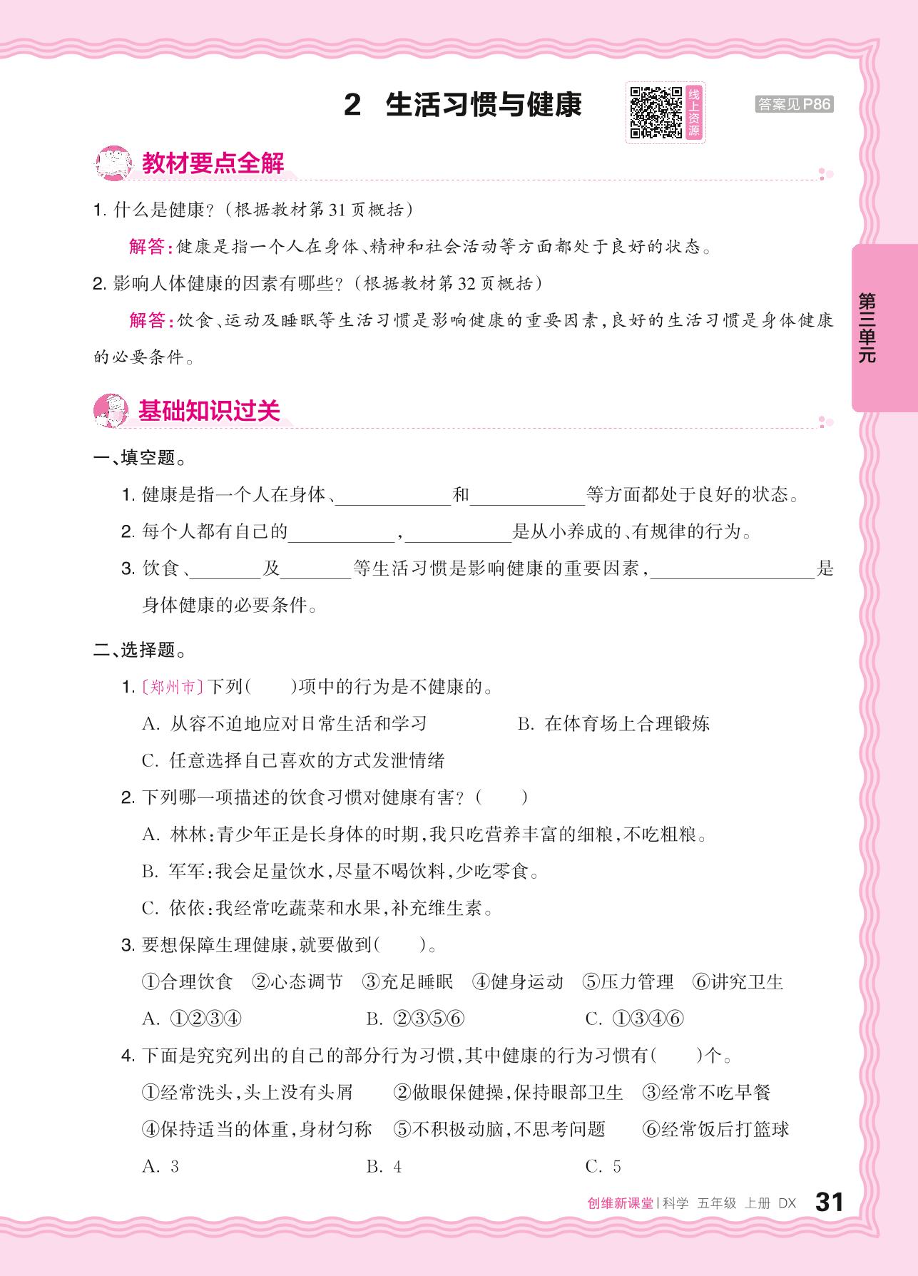 2024秋上册五年级科学大象版 第三单元 健康成长——2. 生活习惯与健康