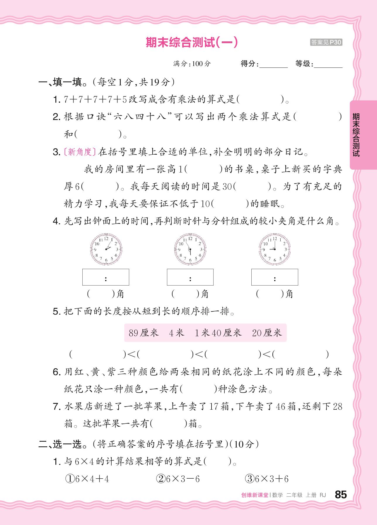 2024秋上册二年级数学人教版 期末综合测试(一)