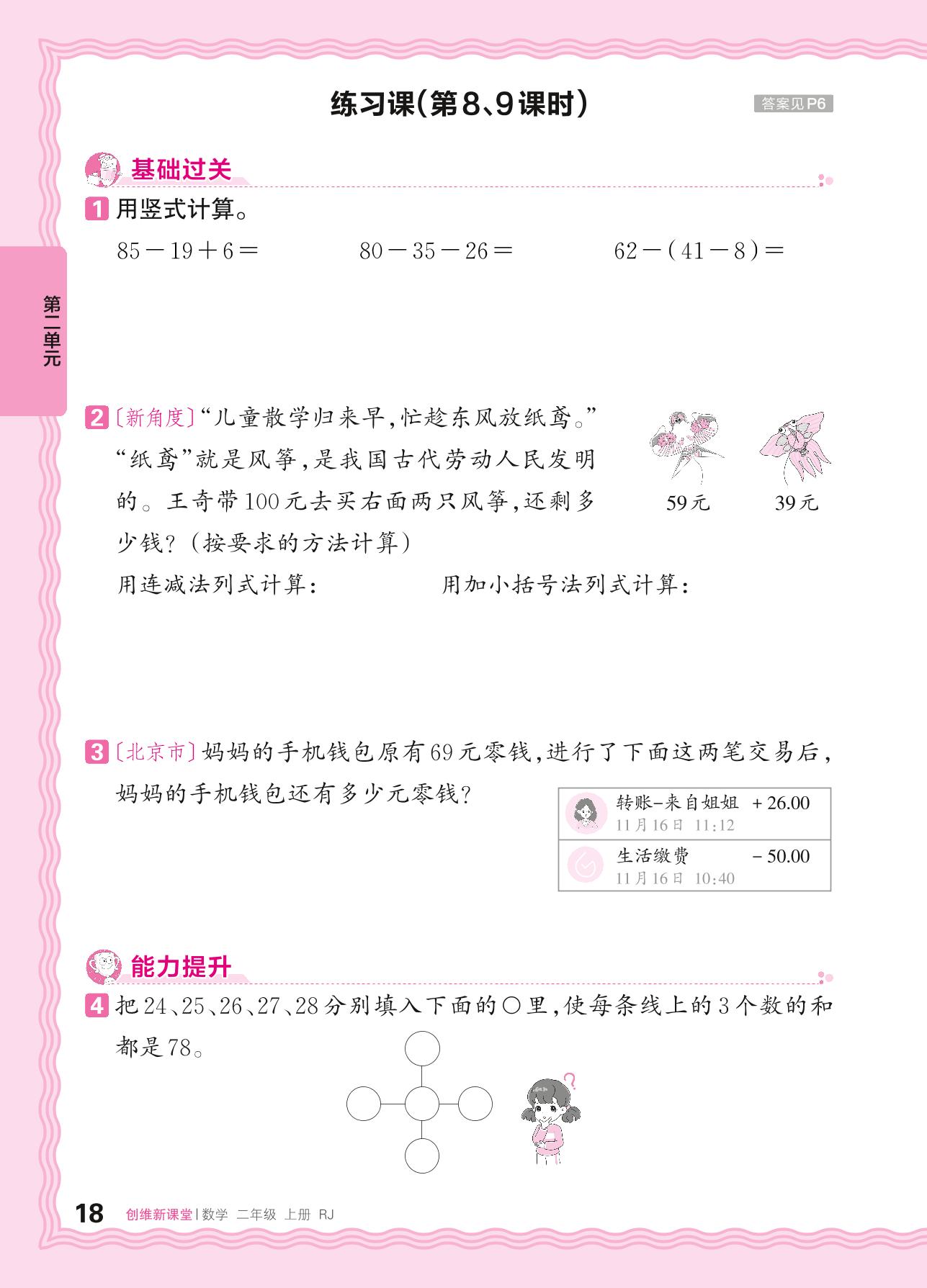 2024秋上册二年级数学人教版 第二单元 100以内的加法和减法(二)——连加、连减和加减混合练习课