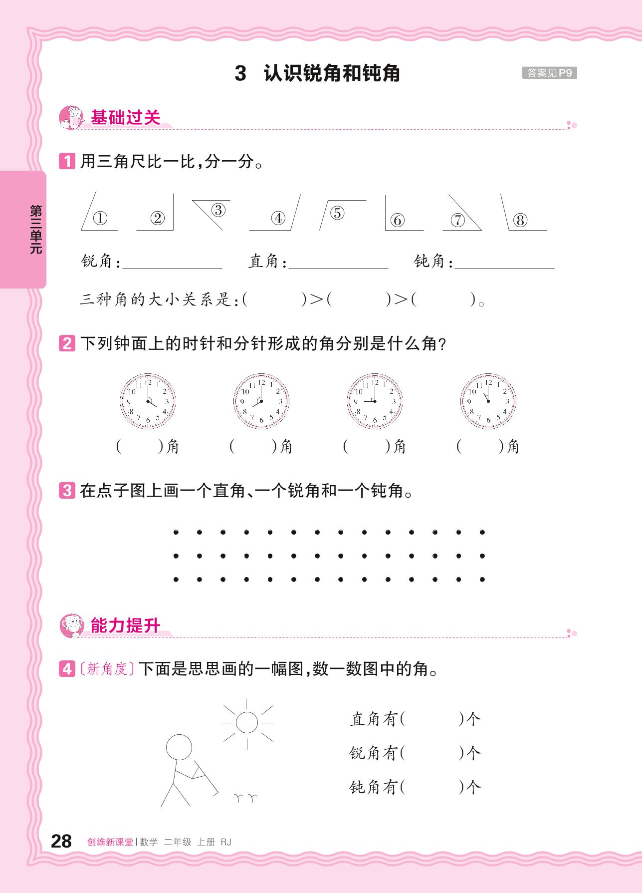 2024秋上册二年级数学人教版 第三单元 角的初步认识——3. 认识锐角和钝角