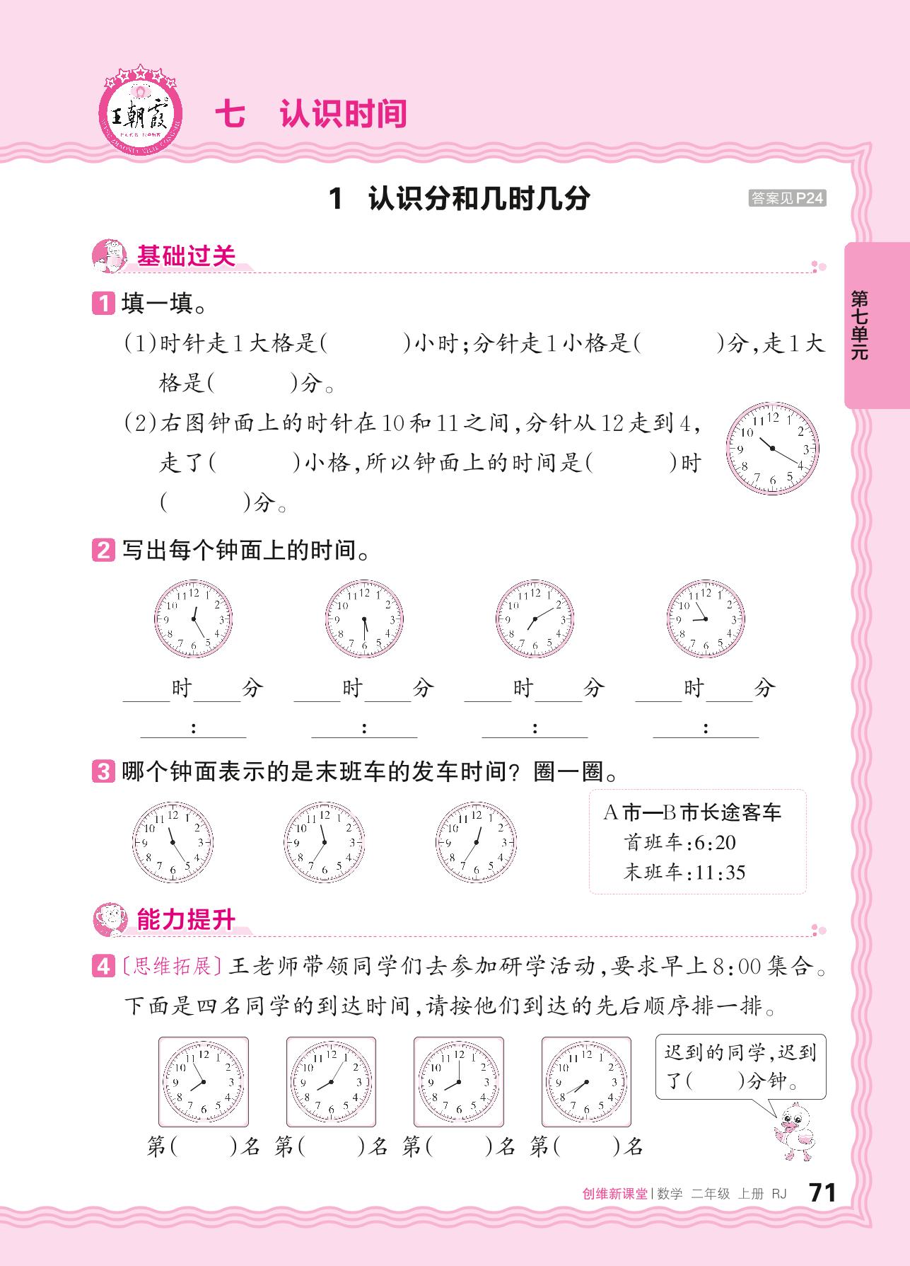 2024秋上册二年级数学人教版 第七单元 认识时间——1. 认识分和几时几分