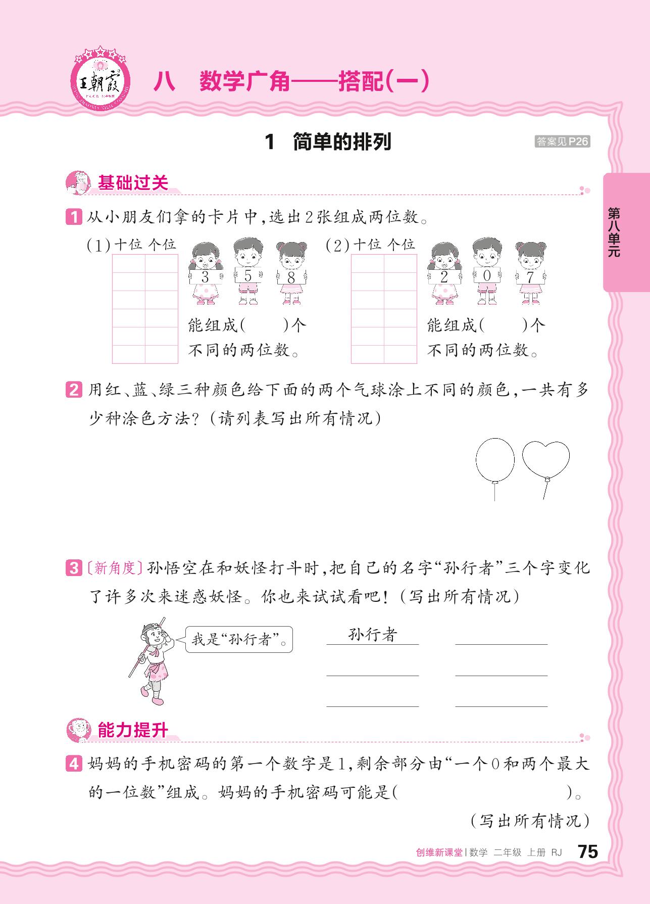 2024秋上册二年级数学人教版 第八单元 数学广角 搭配(一)——1. 简单的排列_R240816143459639
