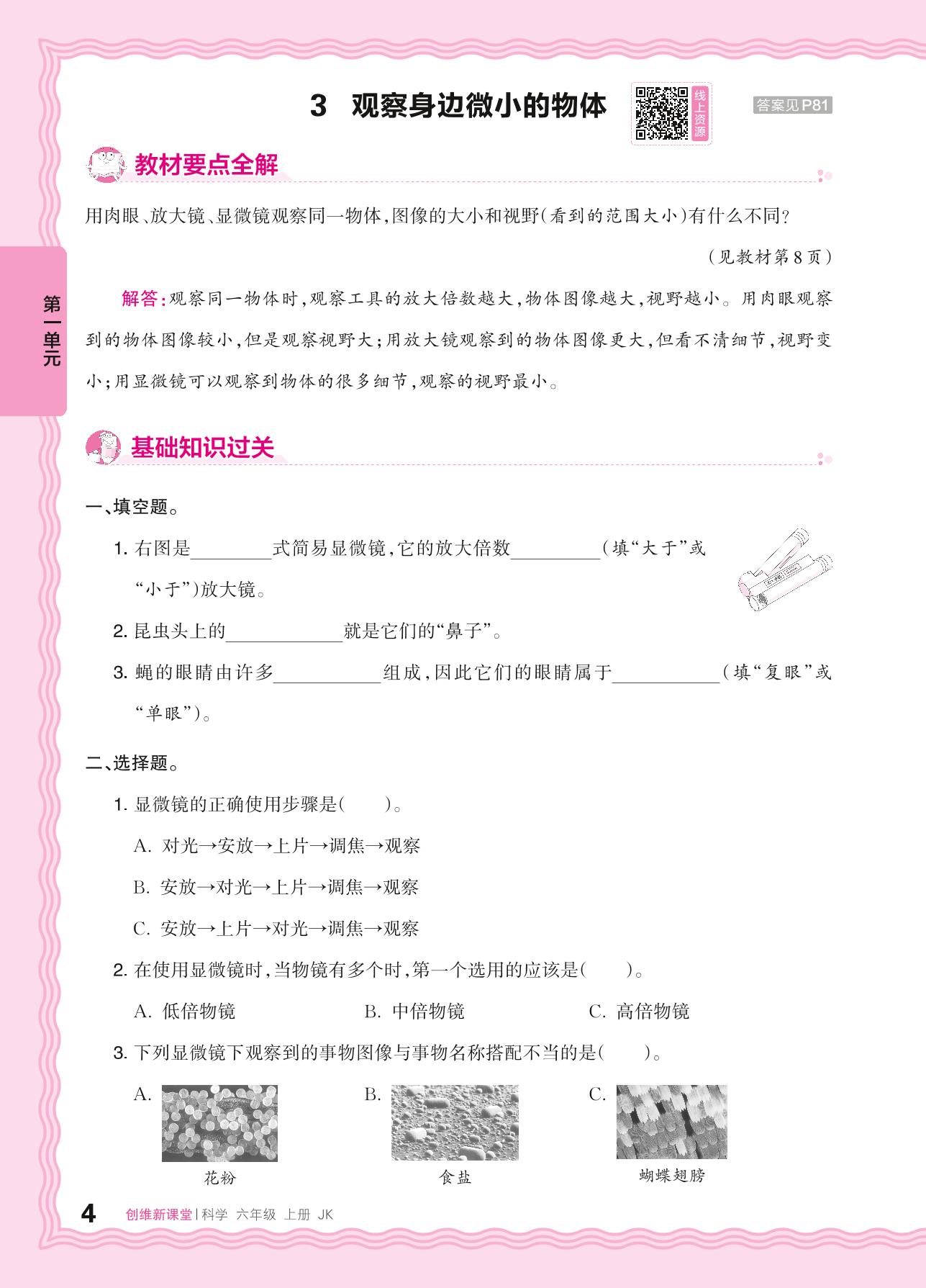 2024秋上册六年级科学教科版 第一单元 微小世界——3. 观察身边微小的物体