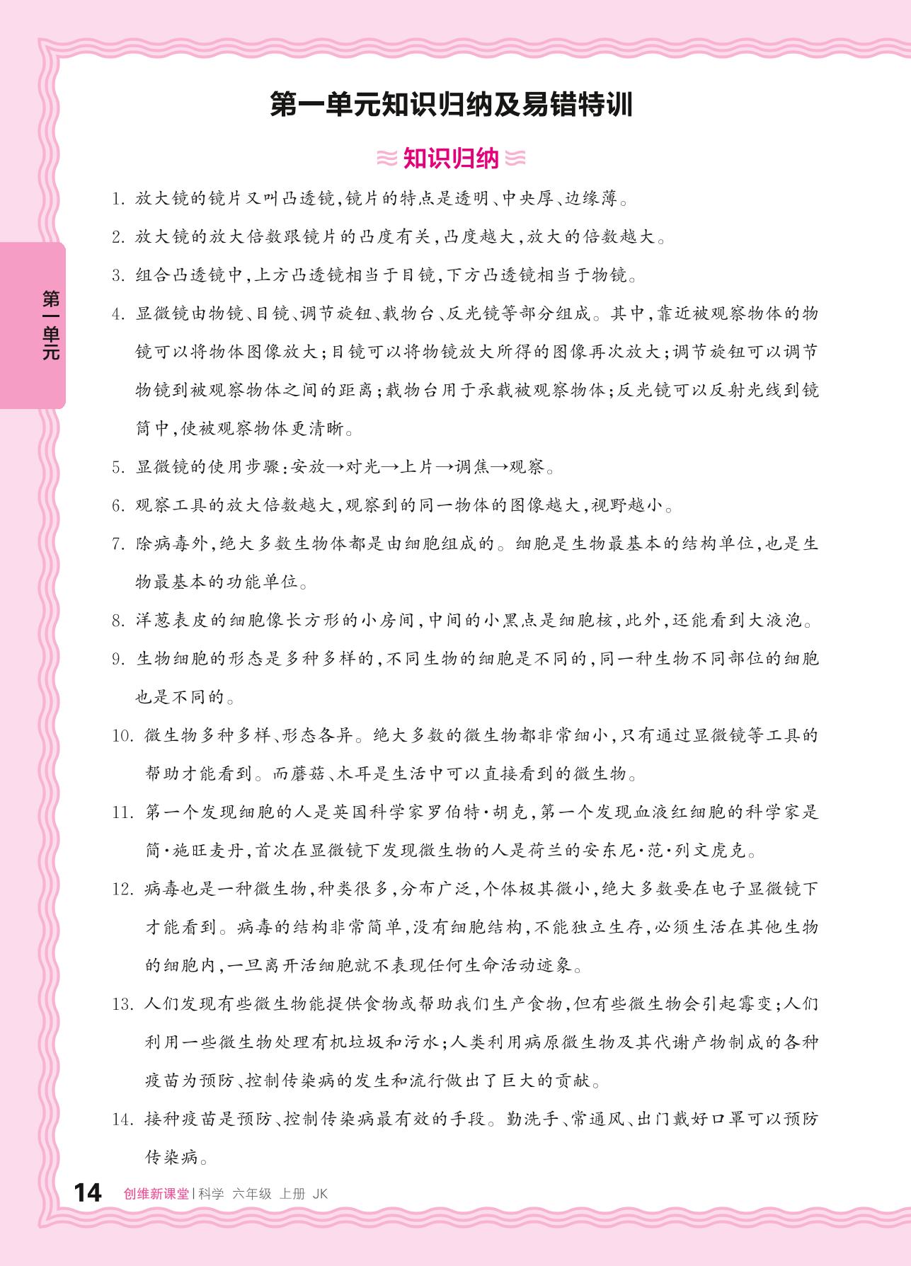 2024秋上册六年级科学教科版 第一单元知识归纳及易错特训