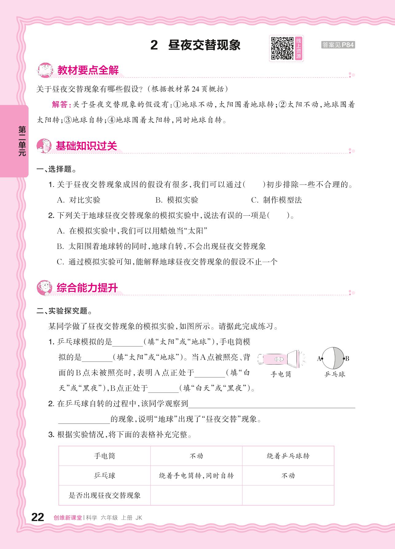 2024秋上册六年级科学教科版 第二单元 地球的运动——2. 昼夜交替现象