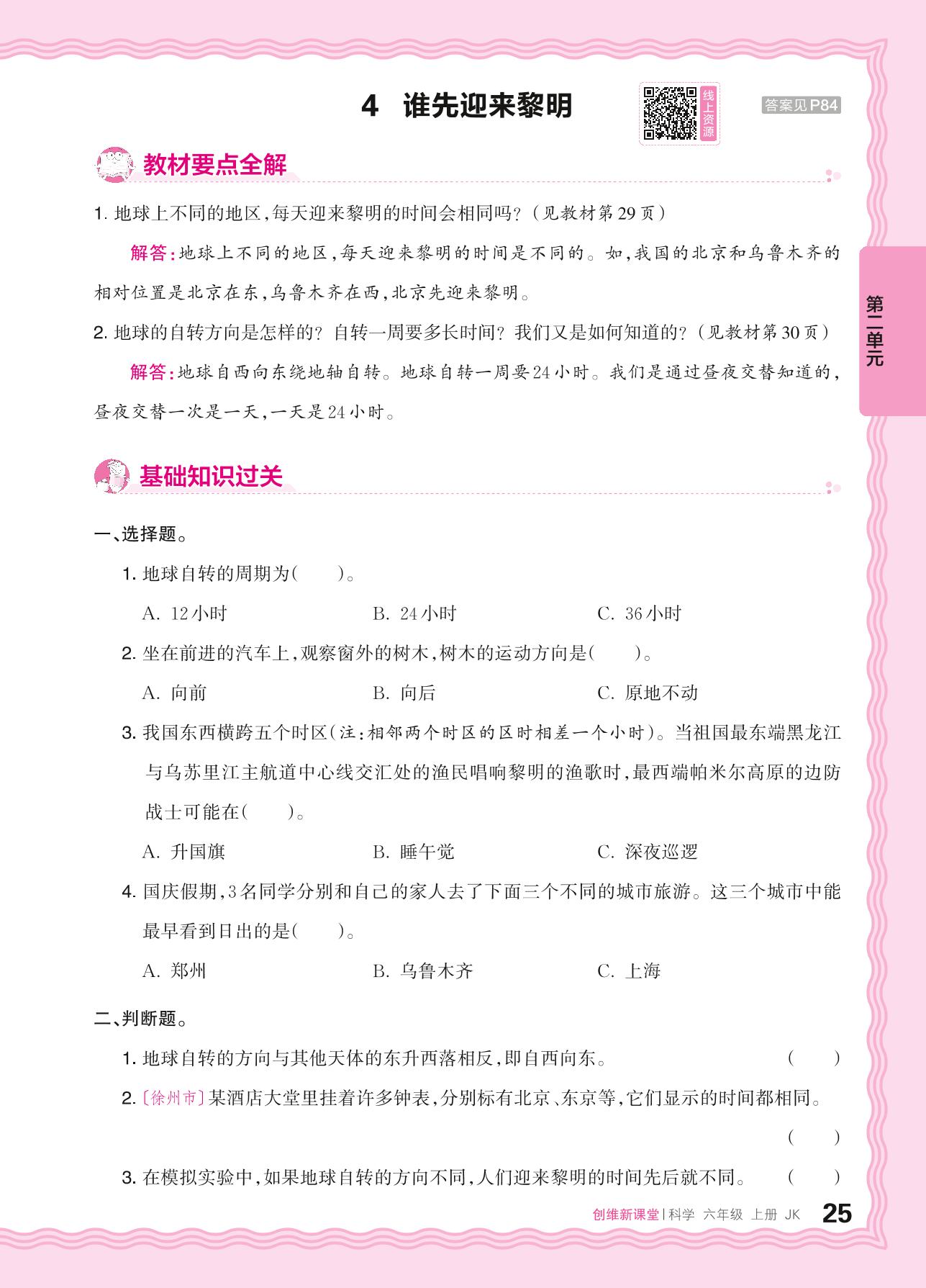 2024秋上册六年级科学教科版 第二单元 地球的运动——4. 谁先迎来黎明