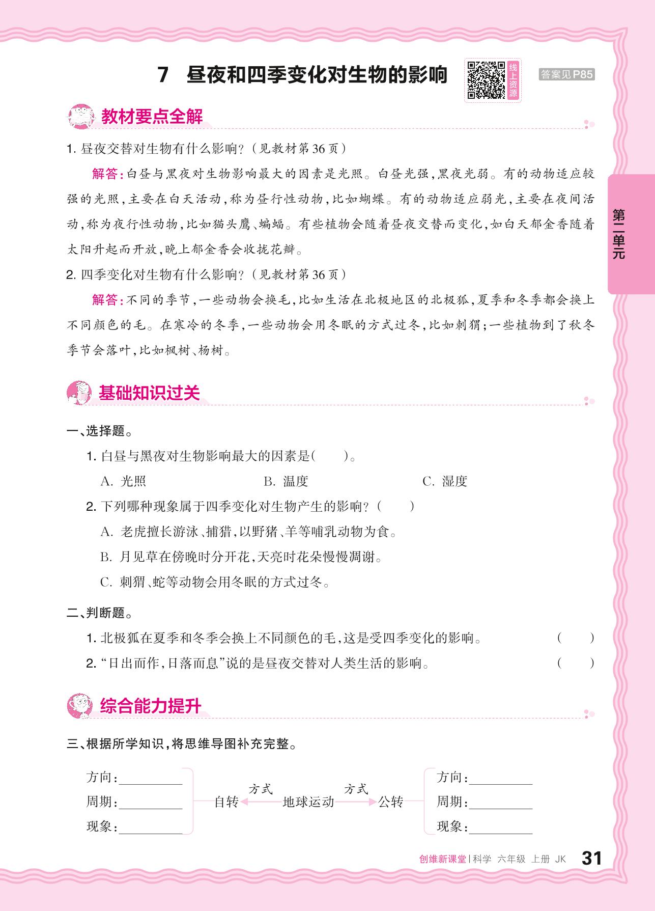 2024秋上册六年级科学教科版 第二单元 地球的运动——7. 昼夜和四季变化对生物的影响