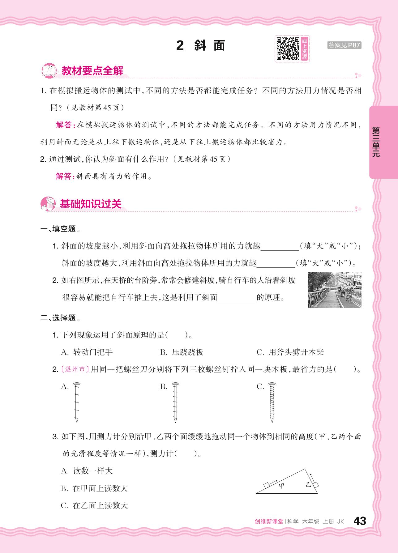 2024秋上册六年级科学教科版 第三单元 工具与技术——2. 斜面