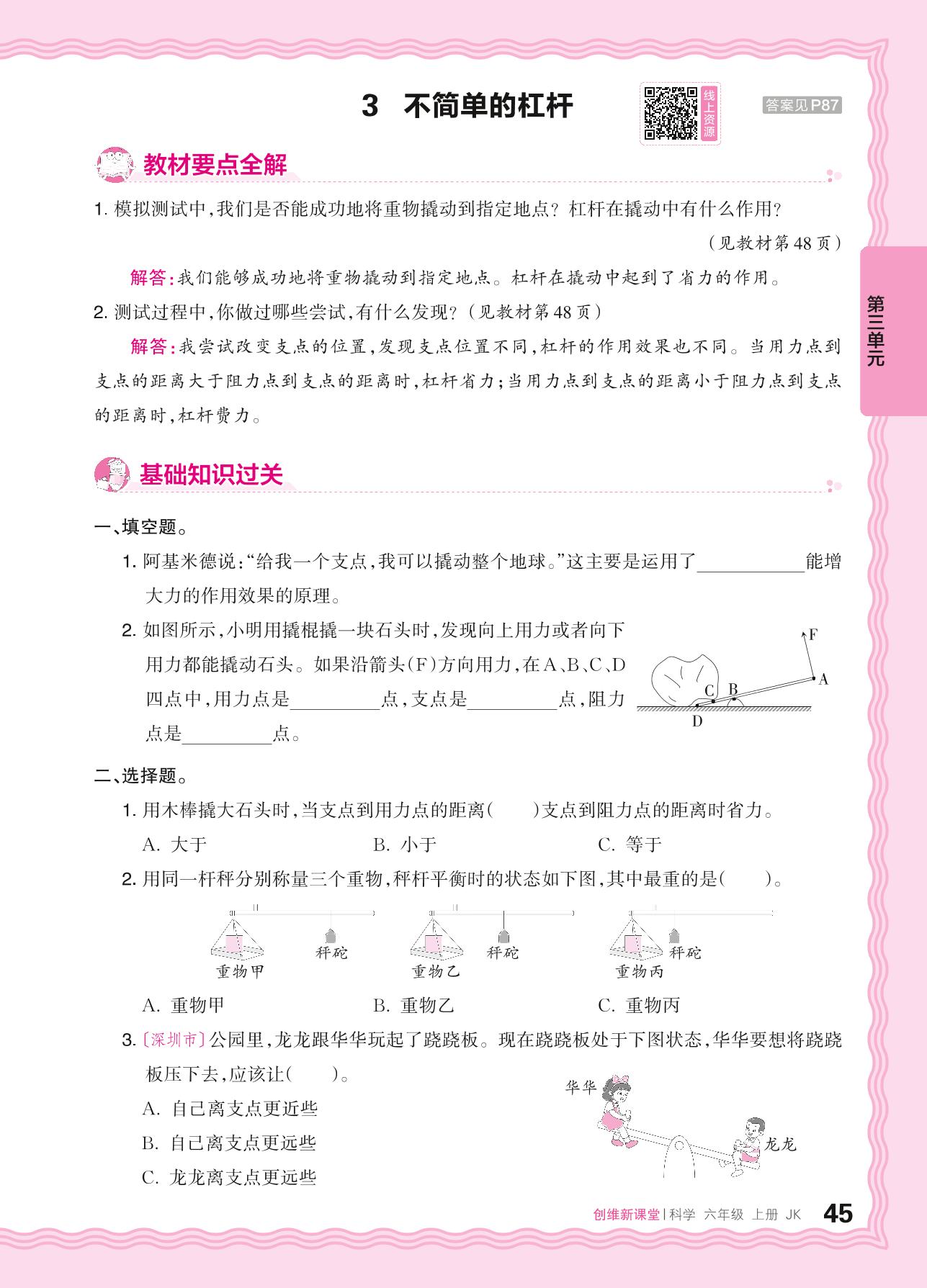 2024秋上册六年级科学教科版 第三单元 工具与技术——3. 不简单的杠杆
