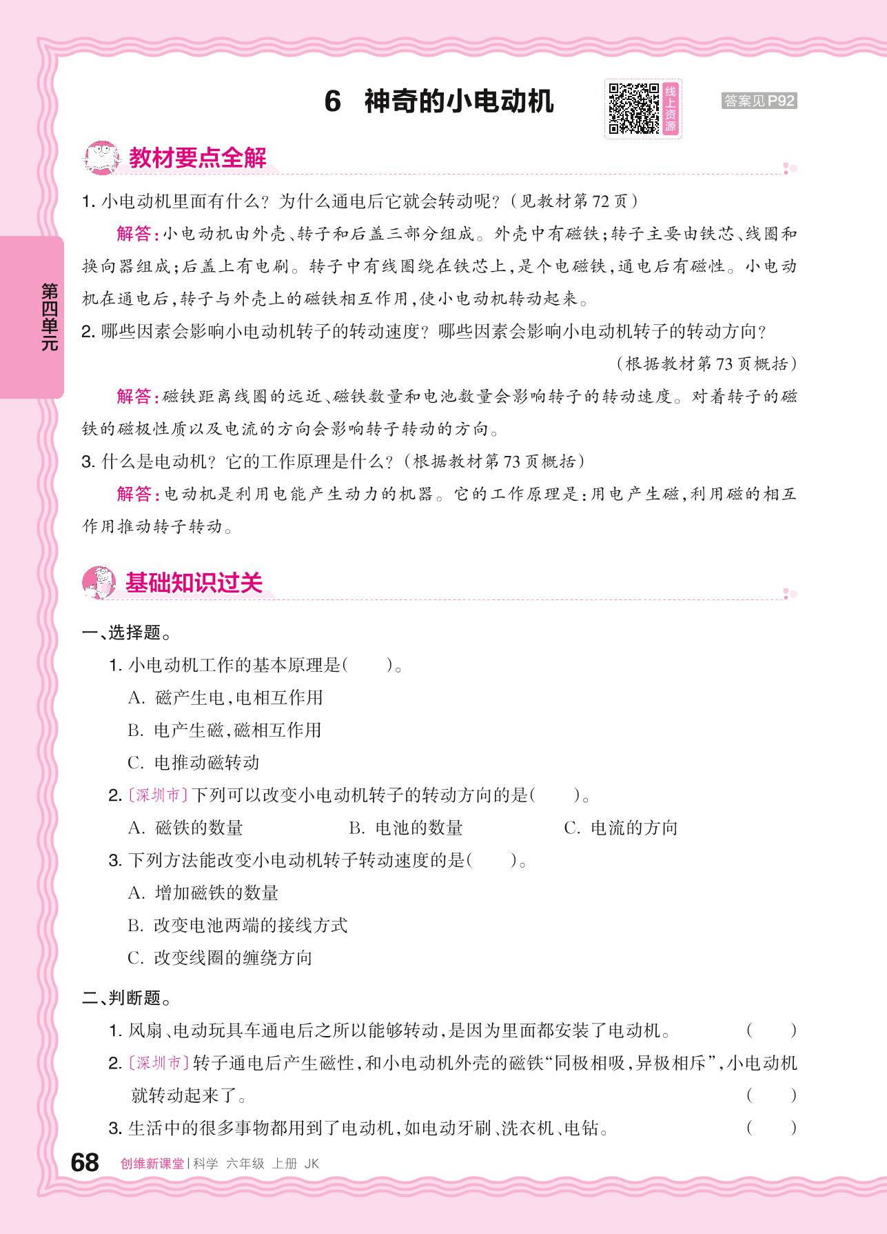 2024秋上册六年级科学教科版 第四单元 能量——6. 神奇的小电动机