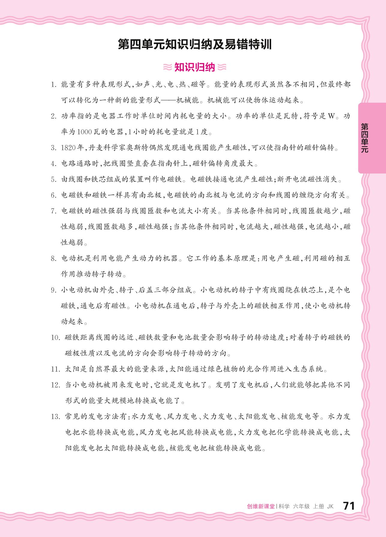 2024秋上册六年级科学教科版 第四单元知识归纳及易错特训