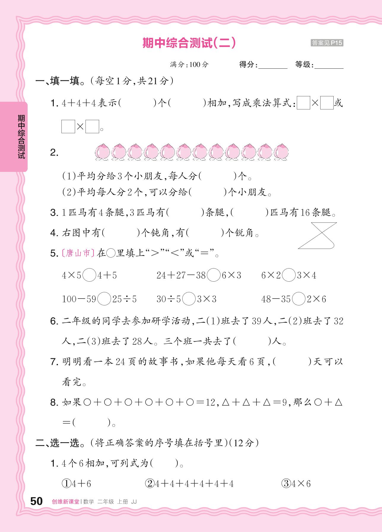 2024秋上册二年级数学冀教版 期中综合测试(二)
