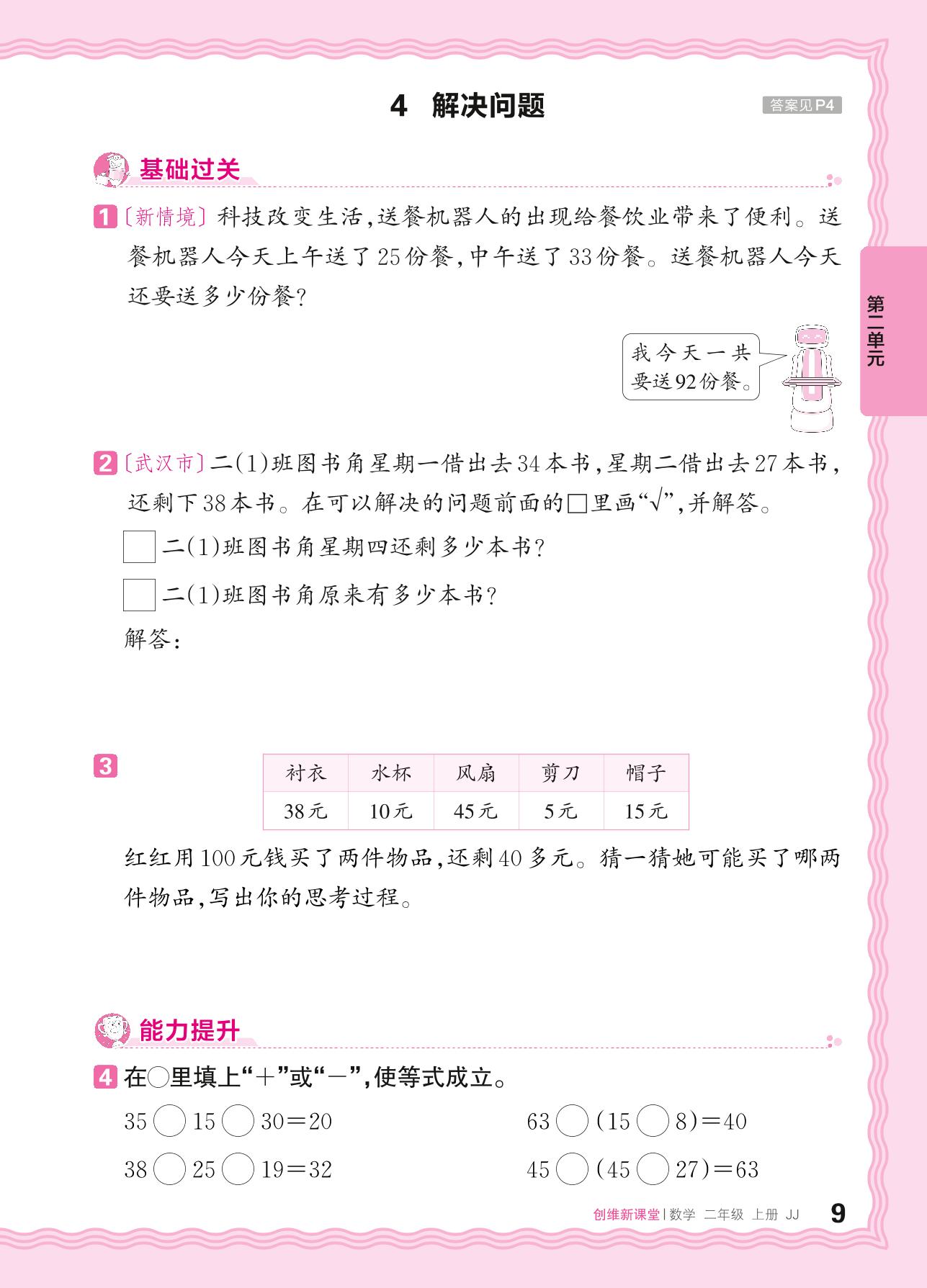 2024秋上册二年级数学冀教版 第二单元 加减混合运算——4. 解决问题