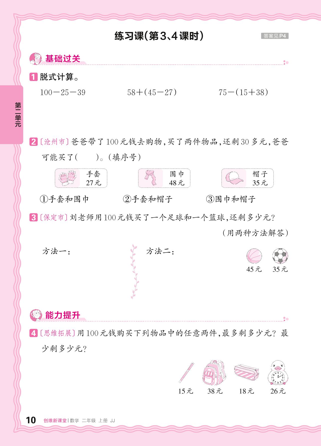 2024秋上册二年级数学冀教版 第二单元 加减混合运算——连减、认识小括号、解决问题练习课