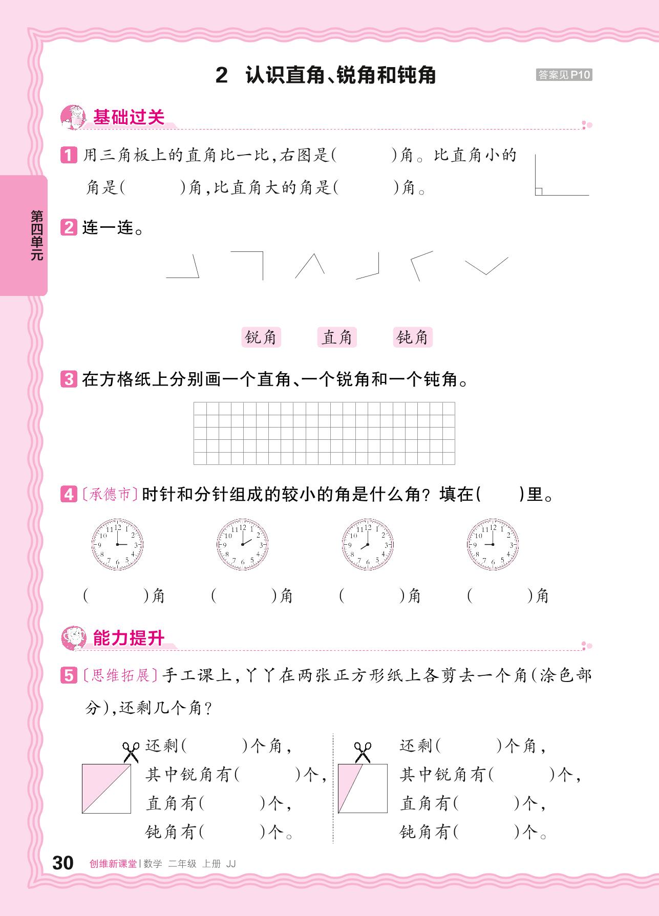 2024秋上册二年级数学冀教版 第四单元 角的认识——2. 认识直角、锐角和钝角