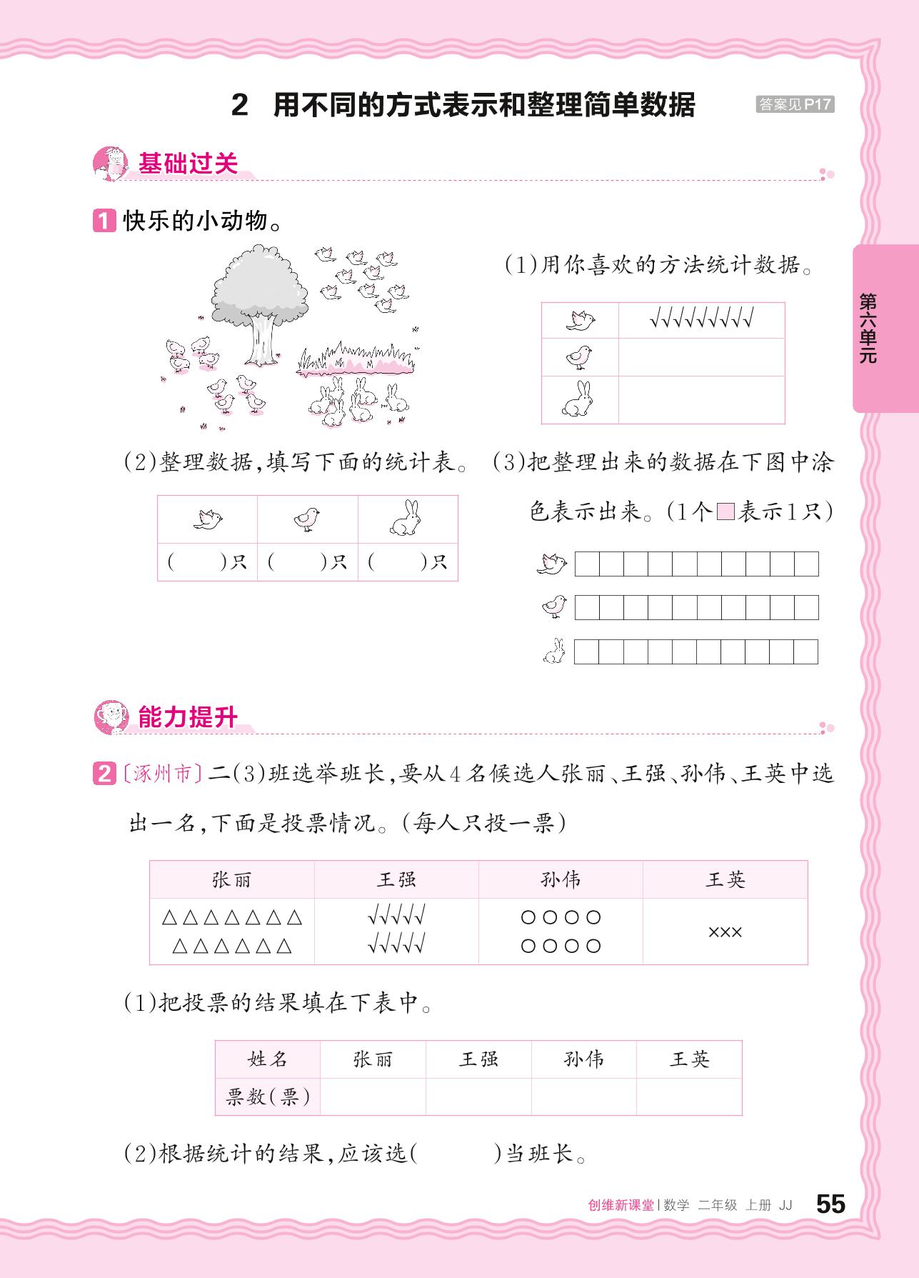 2024秋上册二年级数学冀教版 第六单元 象形统计图和统计表——2. 用不同的方式表示和整理简单数据