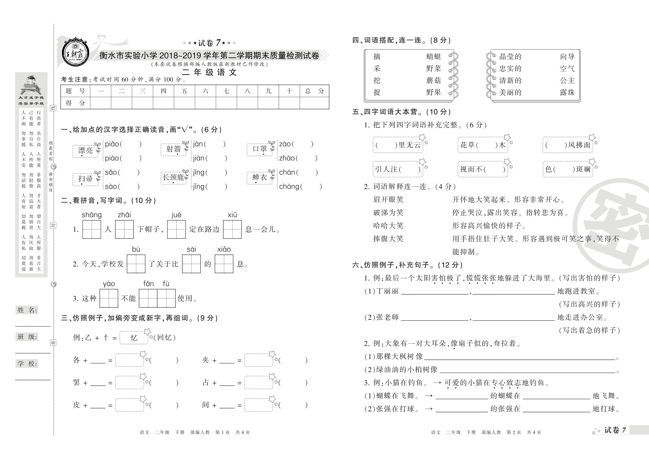 2018-2019学年第二学期衡水市实验小学二年级语文试卷(人教版)【7】