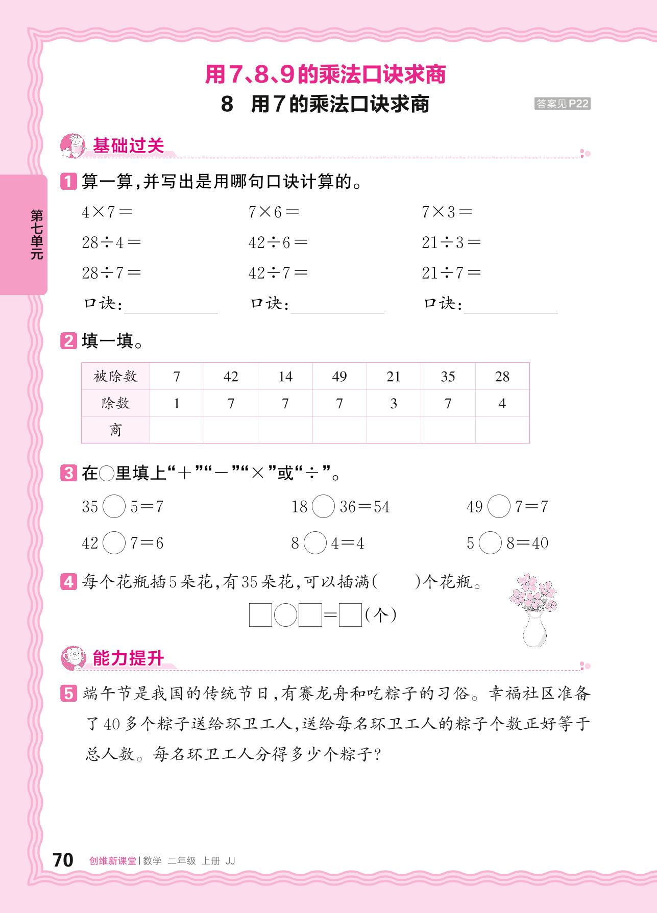 2024秋上册二年级数学冀教版 第七单元 表内乘法和除法(二)——8. 用7的乘法口诀求商