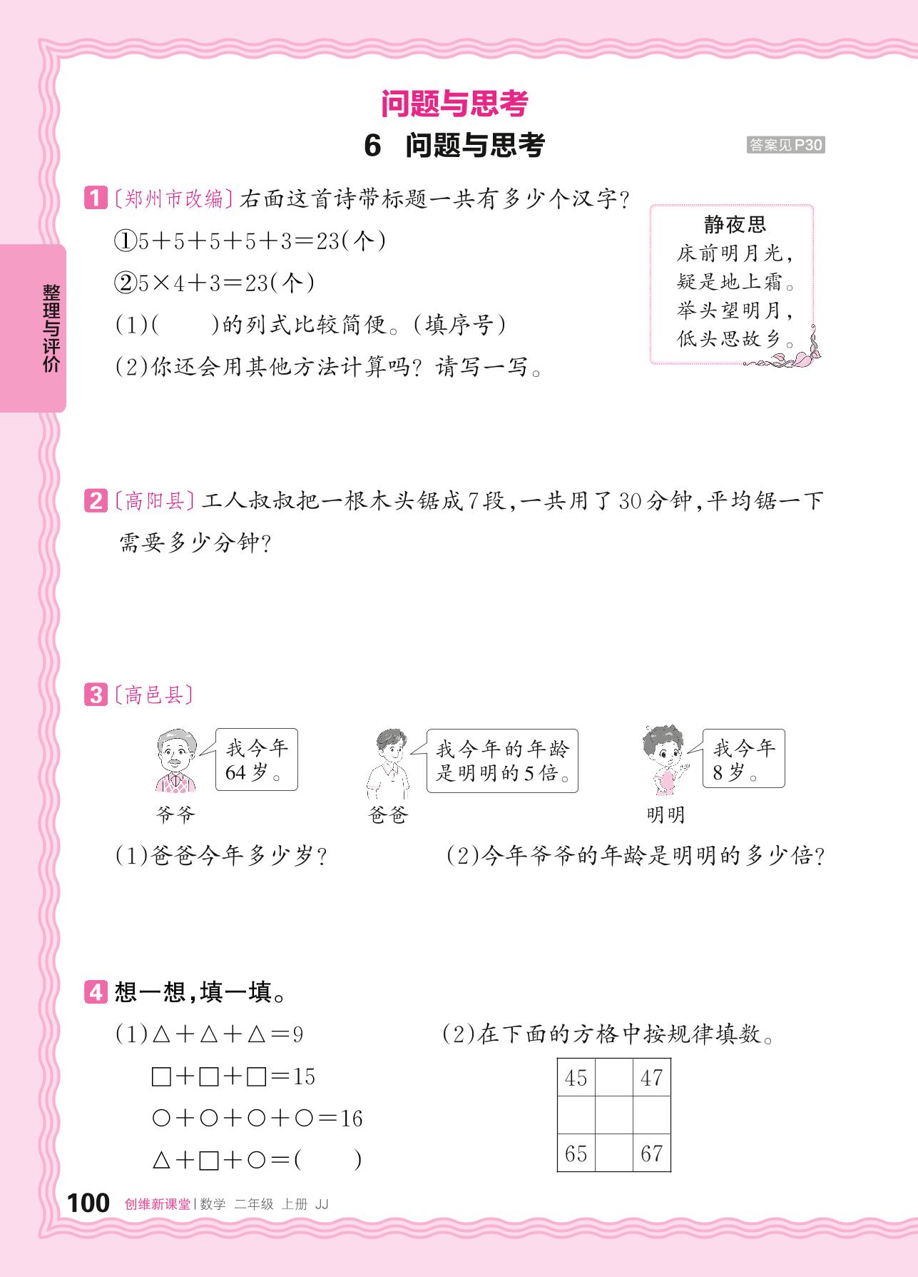 2024秋上册二年级数学冀教版 整理与评价——6. 问题与思考