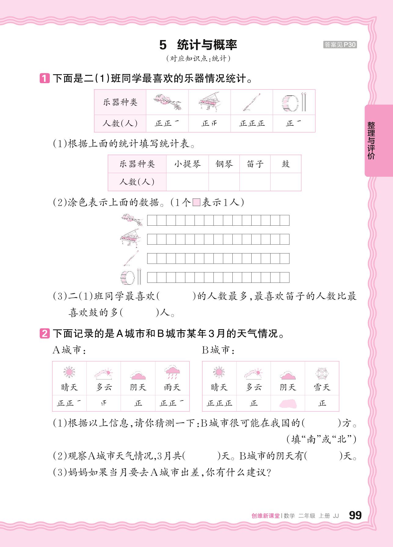 2024秋上册二年级数学冀教版 整理与评价(知识与技能)——5. 统计与概率