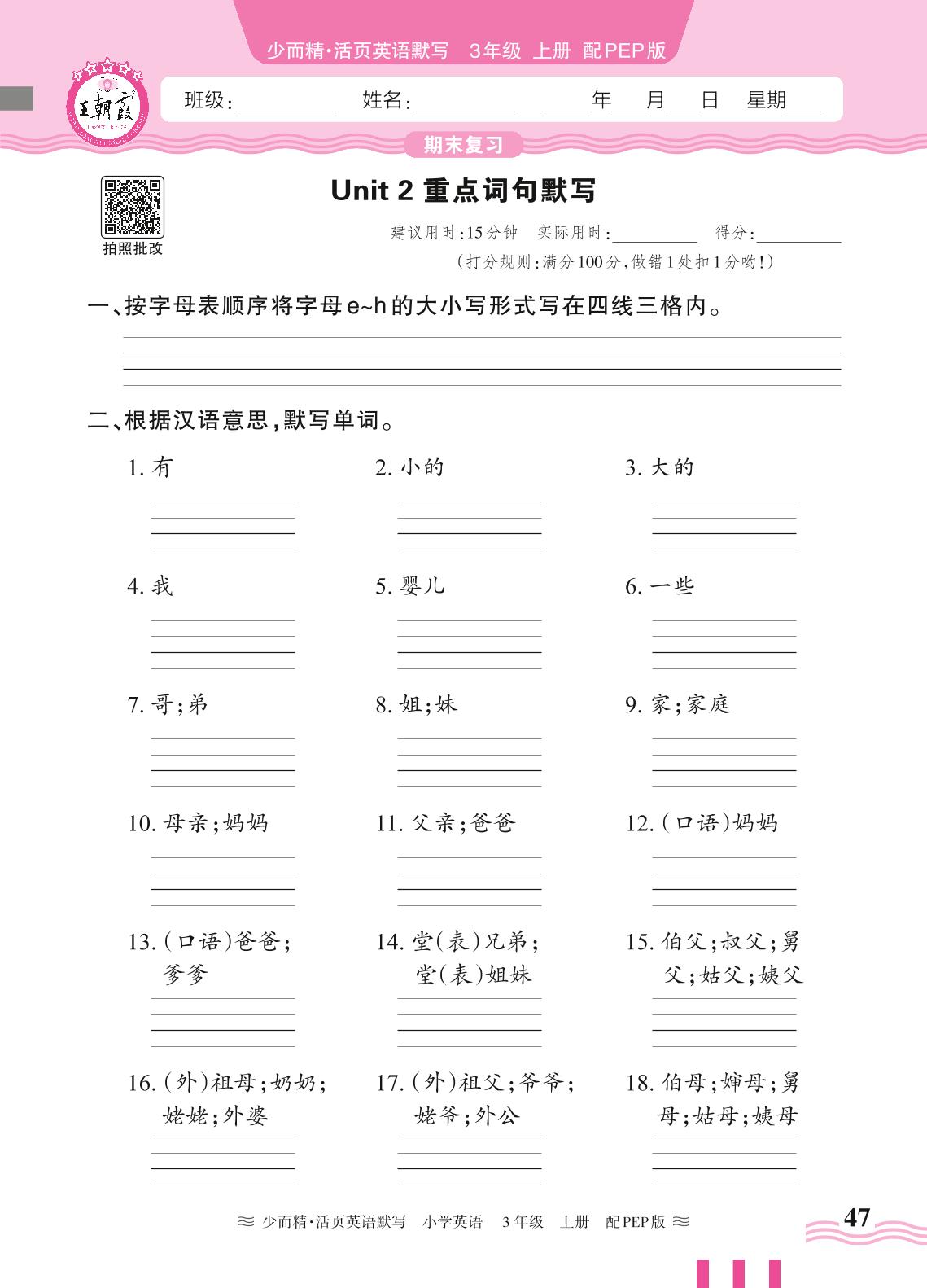 2024秋上册三年级英语人教PEP版(三起始) 期末复习—Unit 2 重点词句默写