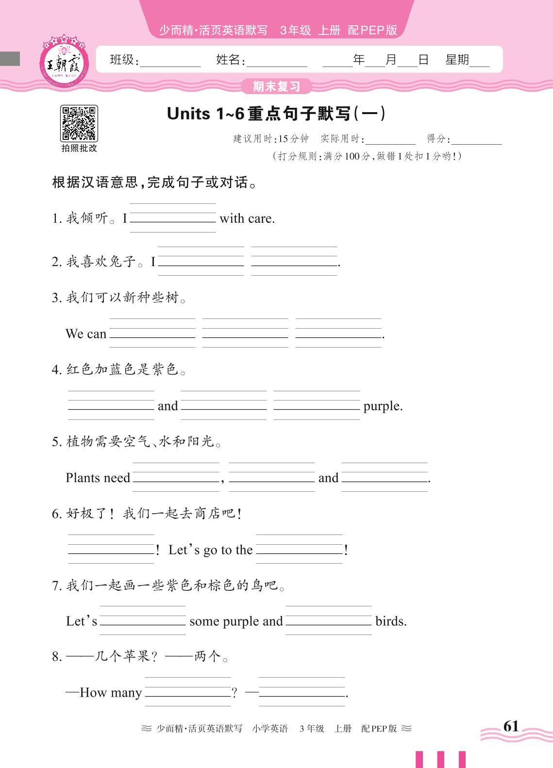 2024秋上册三年级英语人教PEP版(三起始) 期末复习—Units 1~6 重点句子默写(一)