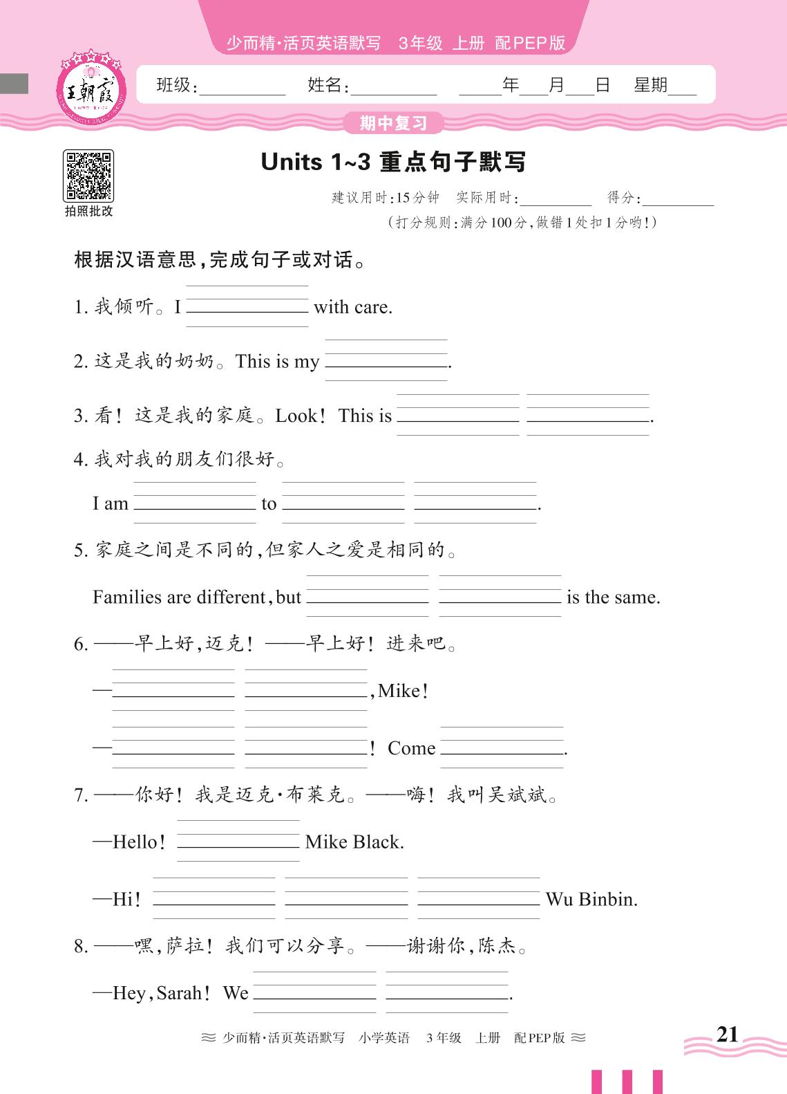 2024秋上册三年级英语人教PEP版(三起始) 期中复习—Units 1~3 重点句子默写