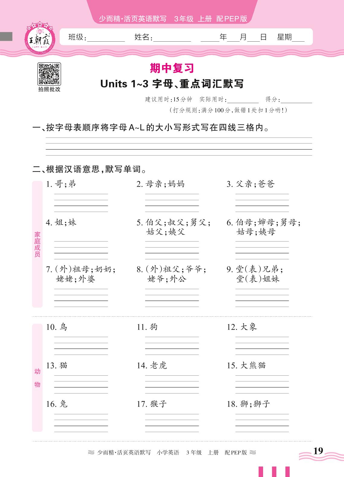 2024秋上册三年级英语人教PEP版(三起始) 期中复习—Units 1~3 字母、重点词汇默写
