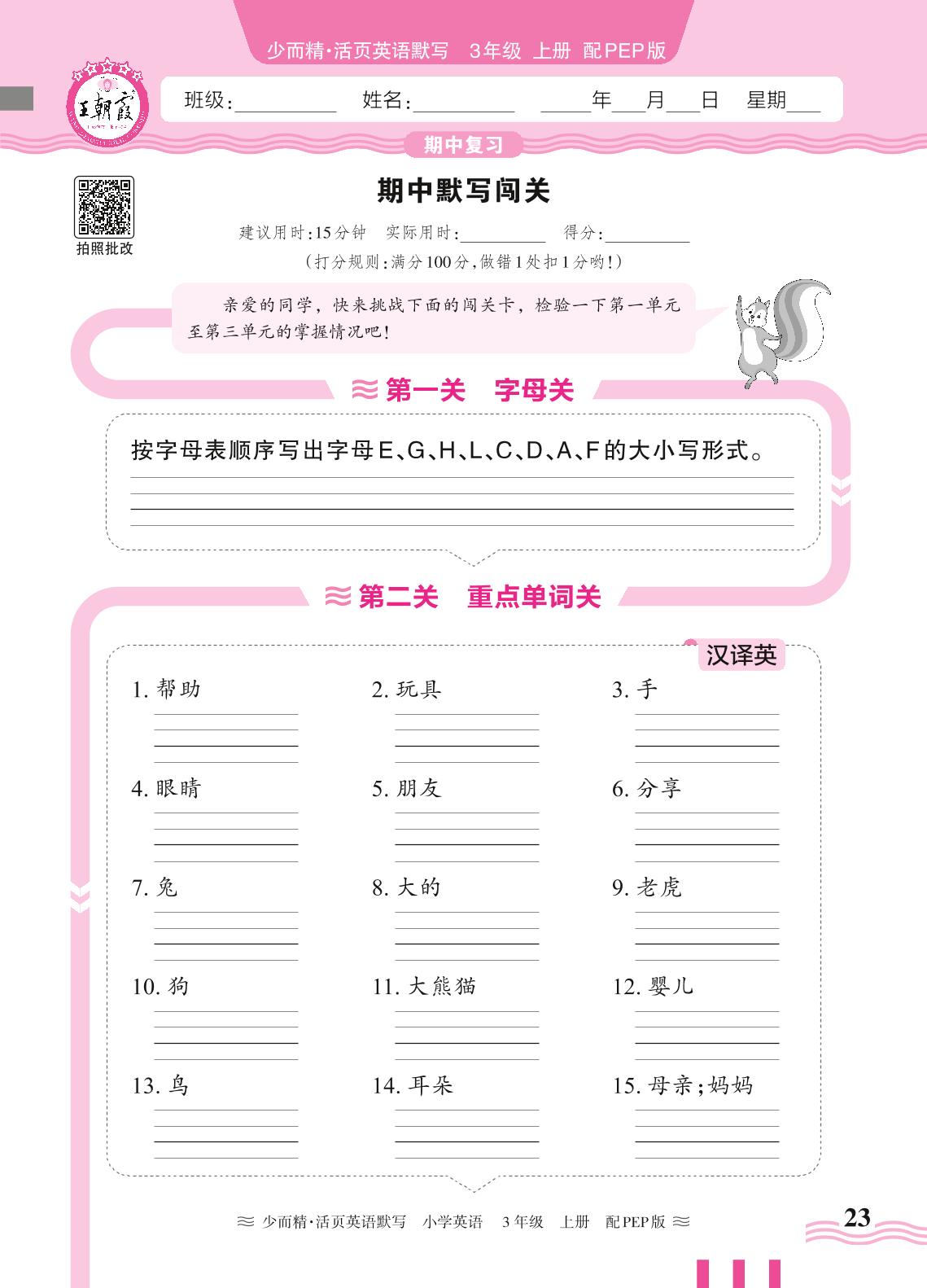2024秋上册三年级英语人教PEP版(三起始) 期中默写闯关