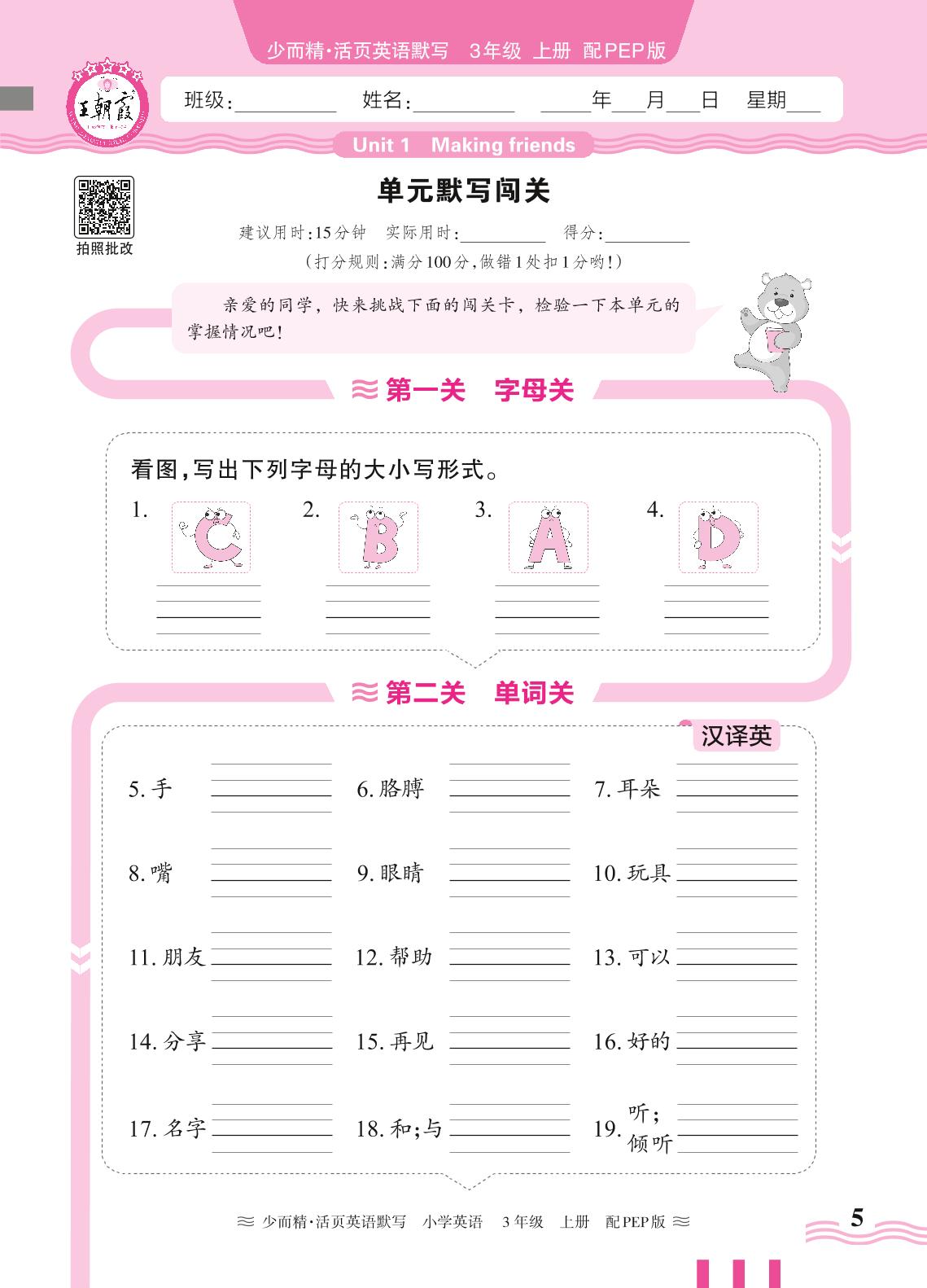 2024秋上册三年级英语人教PEP版(三起始) Unit 1 单元默写闯关
