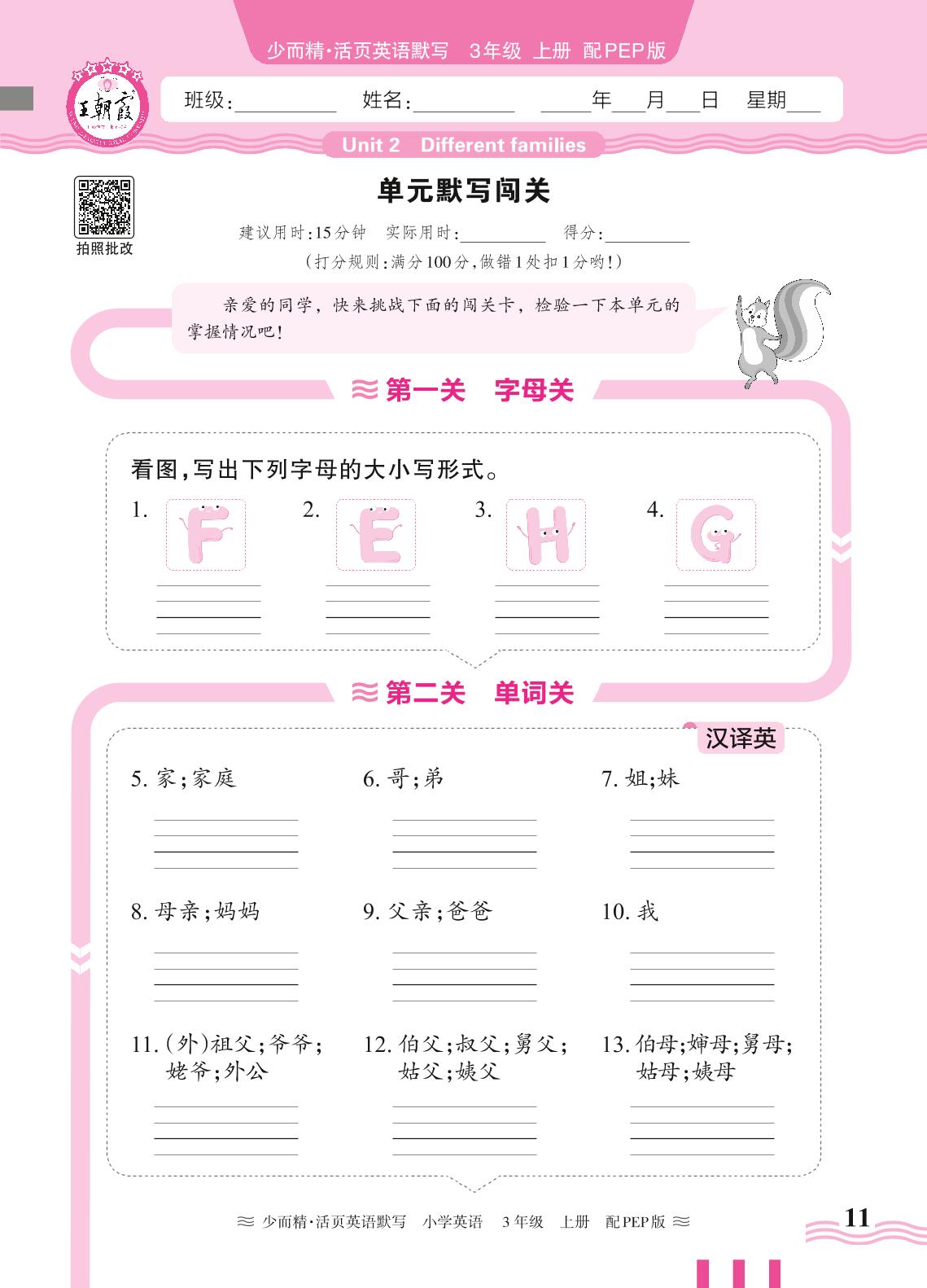 2024秋上册三年级英语人教PEP版(三起始) Unit 2 单元默写闯关