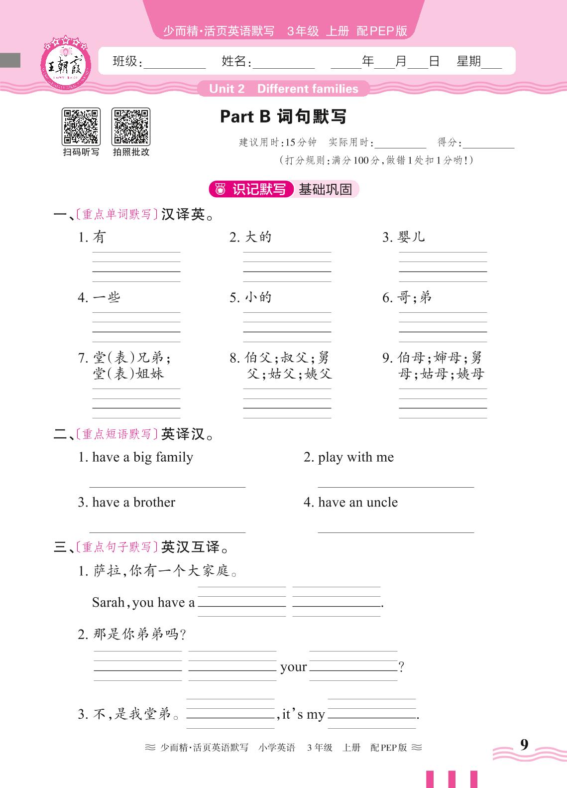 2024秋上册三年级英语人教PEP版(三起始) Unit 2—Part B 词句默写