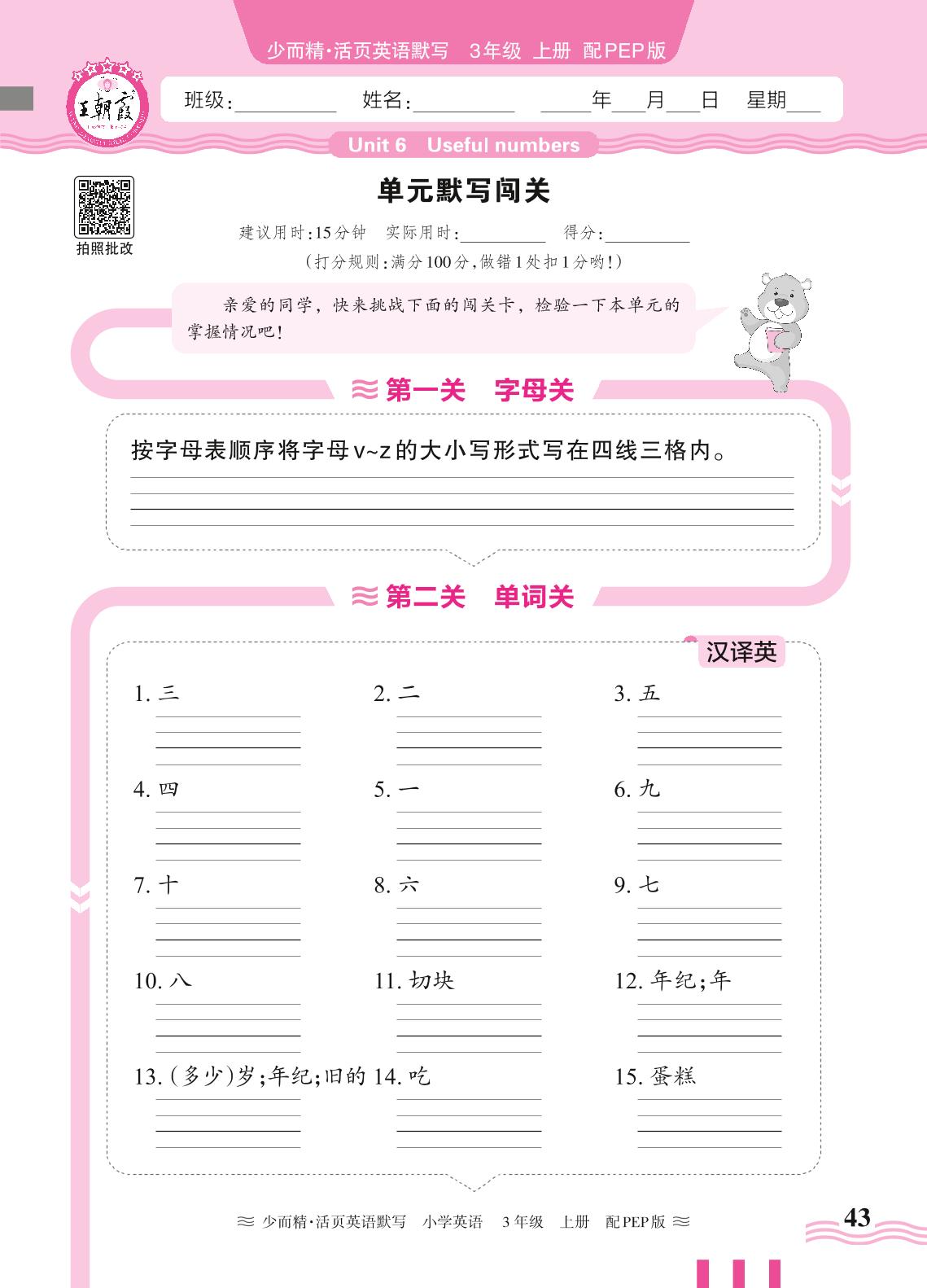 2024秋上册三年级英语人教PEP版(三起始) Unit 6 单元默写闯关