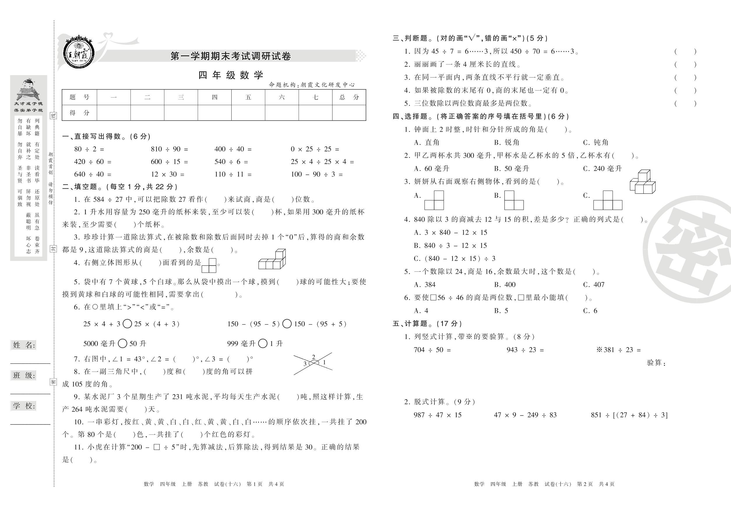 王朝霞期末调研卷四年级上册数学(苏教版)【16】