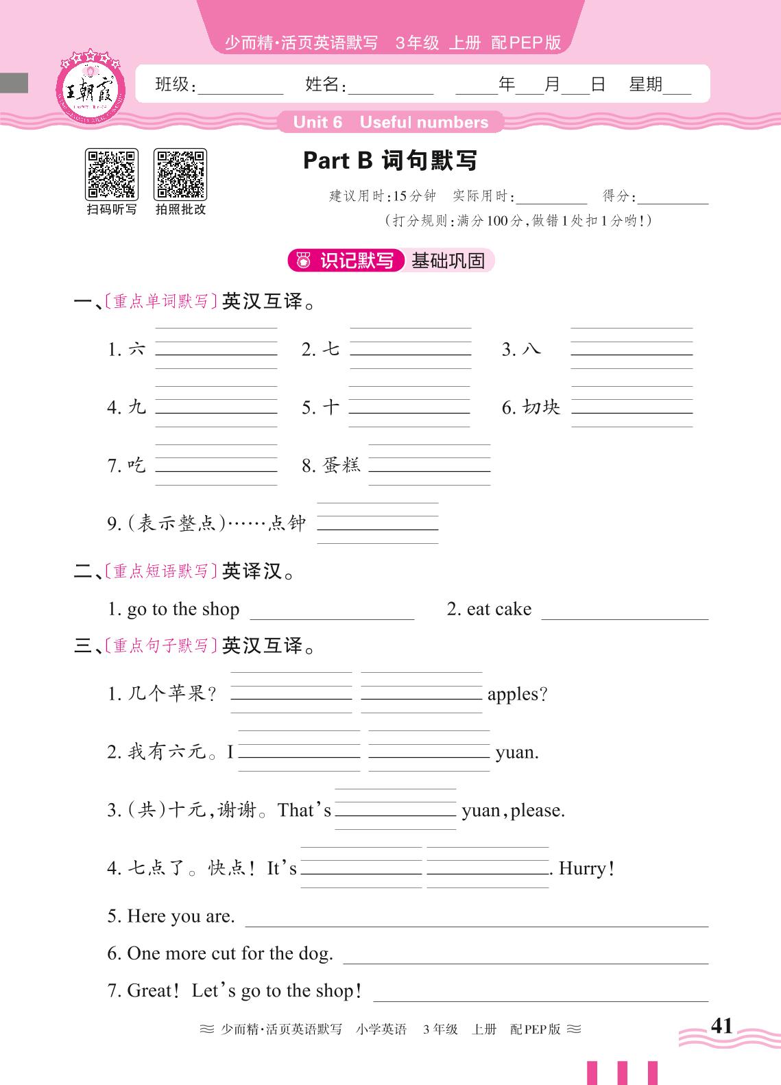 2024秋上册三年级英语人教PEP版(三起始) Unit 6—Part B 词句默写