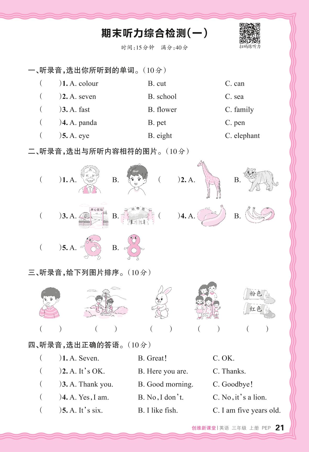 2024秋上册三年级英语人教PEP版(三起始) 期末听力综合检测(一)