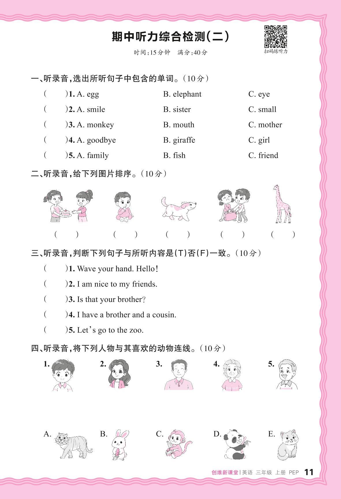 2024秋上册三年级英语人教PEP版(三起始) 期中听力综合检测(二)