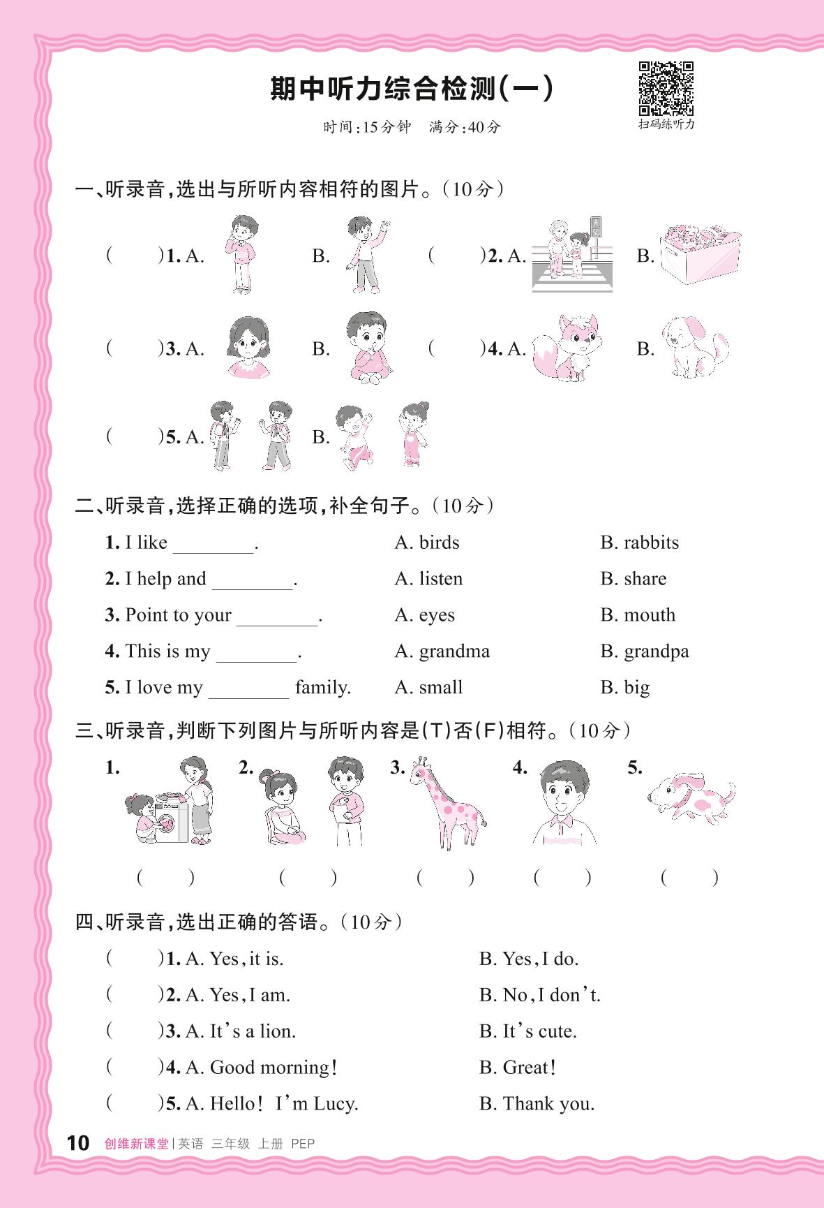 2024秋上册三年级英语人教PEP版(三起始) 期中听力综合检测(一)