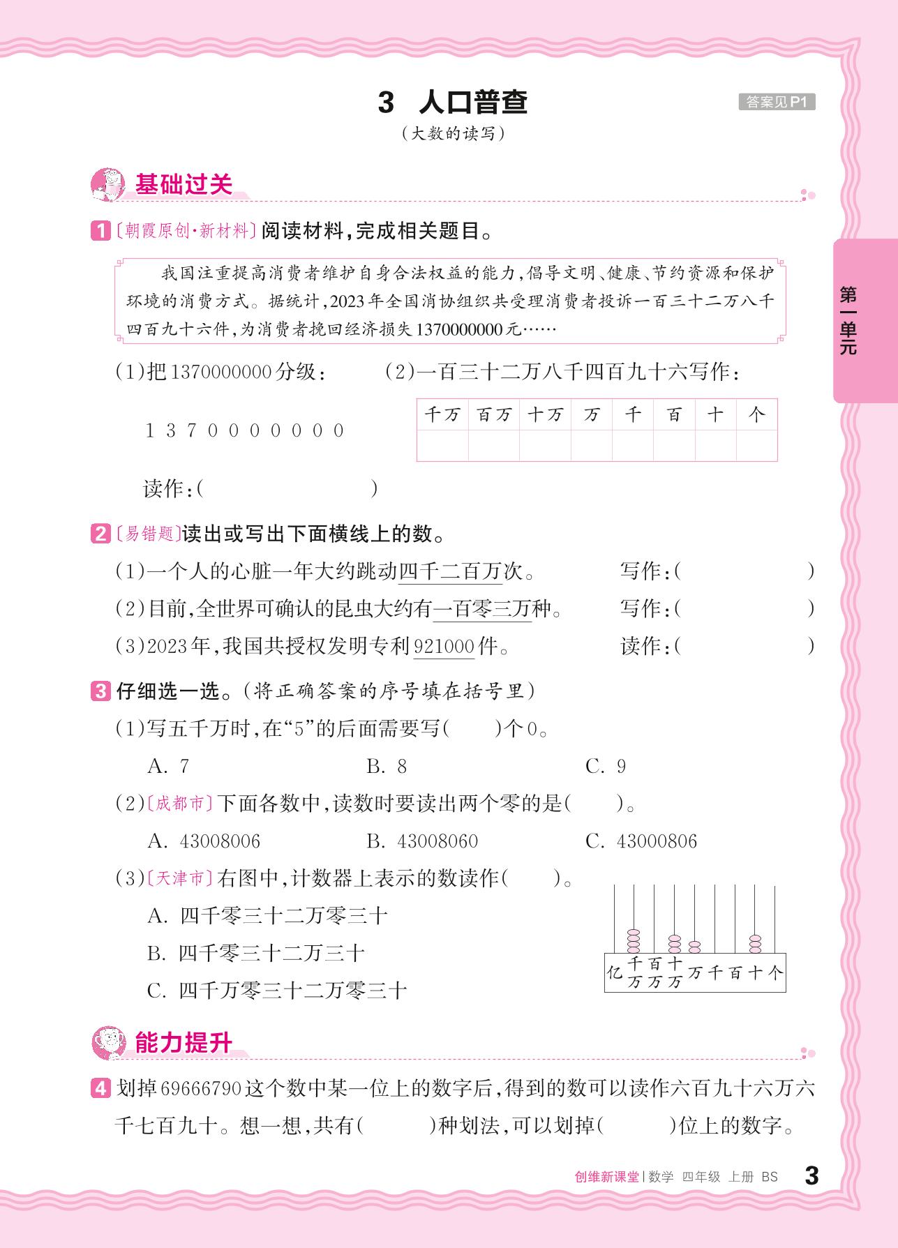 2024秋上册四年级数学北师版 第一单元 认识更大的数——3. 人口普查