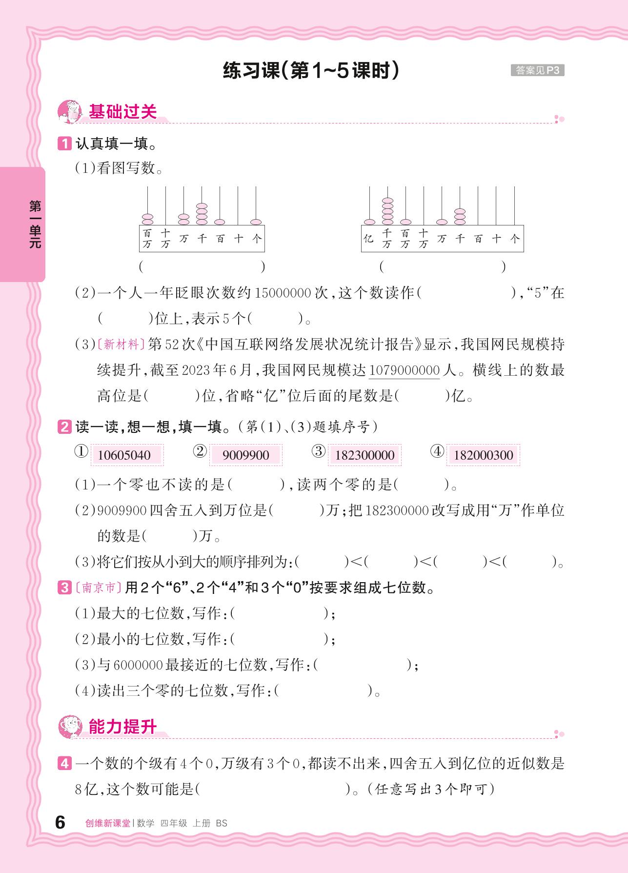 2024秋上册四年级数学北师版 第一单元 认识更大的数——数一数、认识更大的数、人口普查、国土面积、近似数练习课