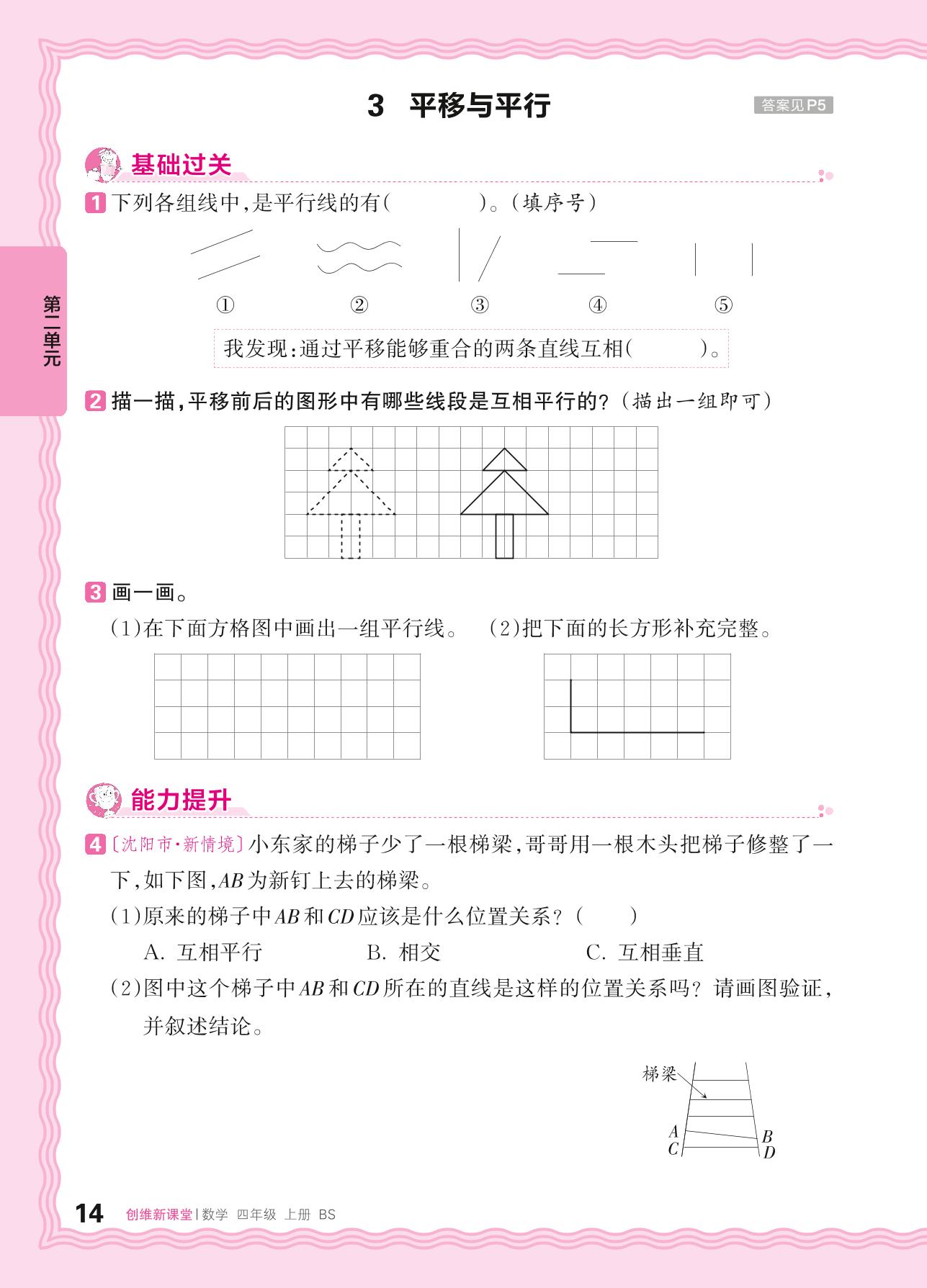 2024秋上册四年级数学北师版 第二单元 线与角——3. 平移与平行