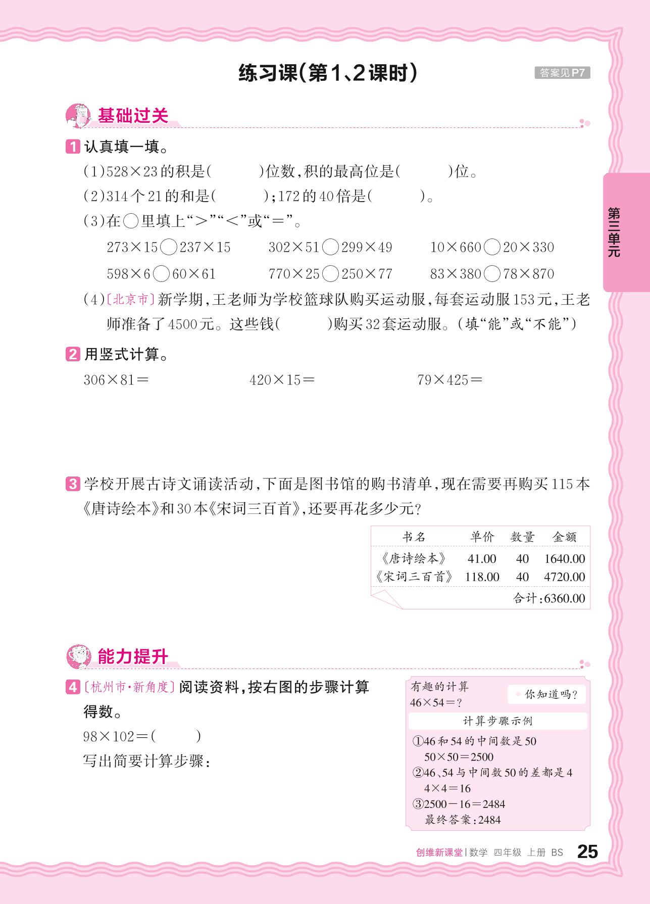 2024秋上册四年级数学北师版 第三单元 乘法——卫星运行时间练习课
