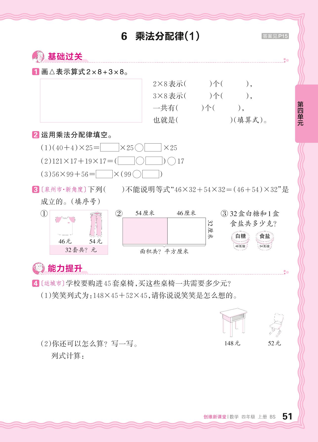 2024秋上册四年级数学北师版 第四单元 运算律——6. 乘法分配律(1)