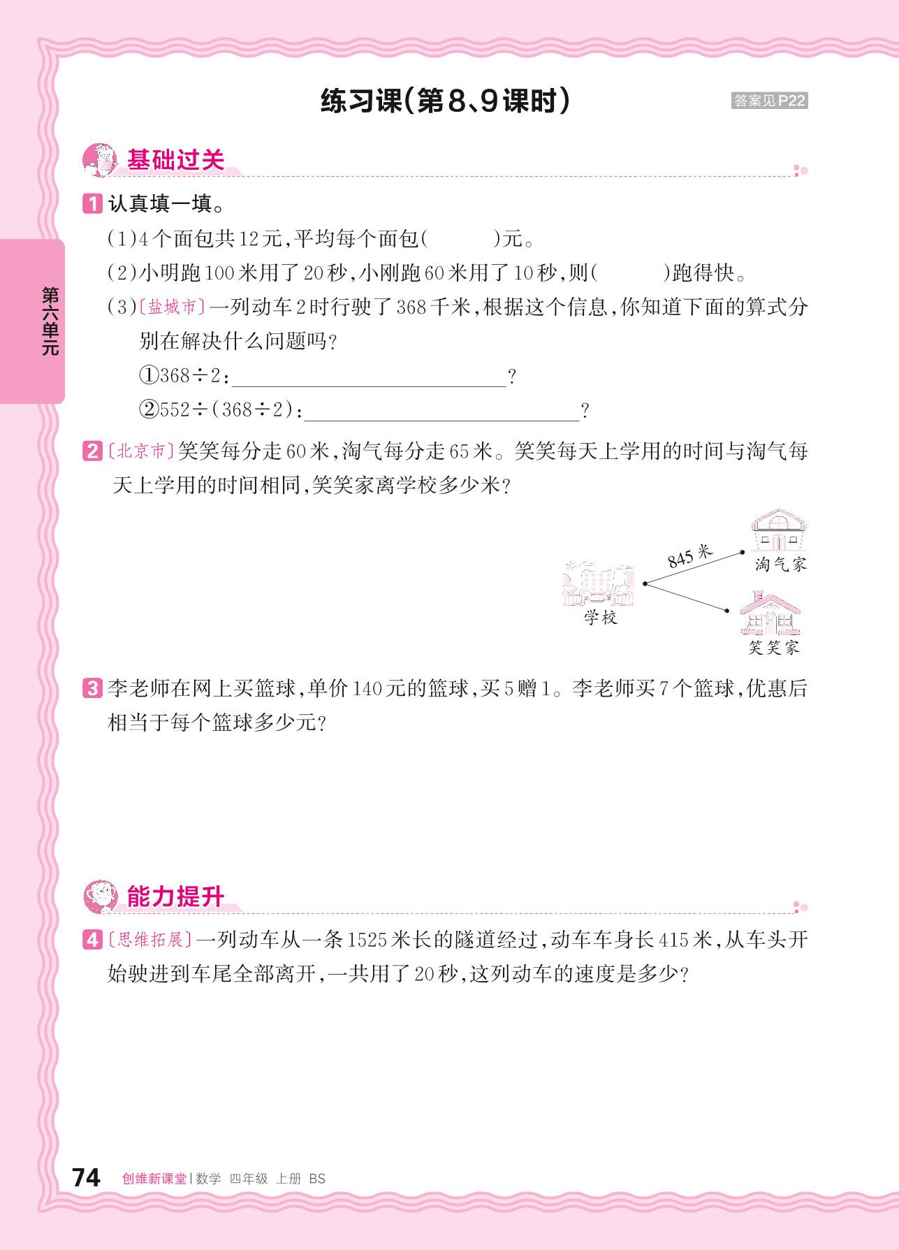 2024秋上册四年级数学北师版 第六单元 除法——路程、时间与速度、总价、数量与单价练习课