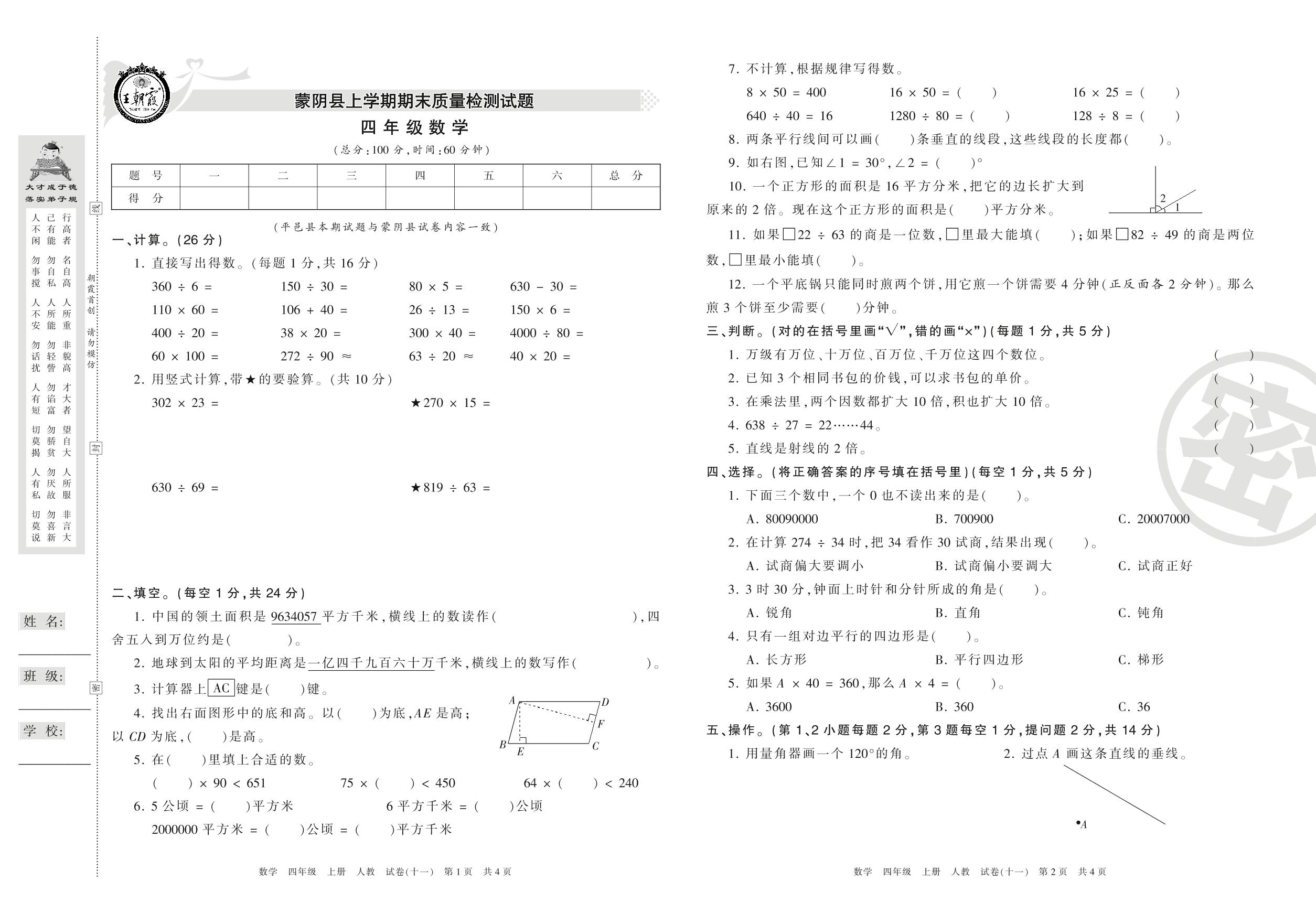 2016-2017学年第一学期临沂市蒙阴县四年级数学试卷(人教版)【11】