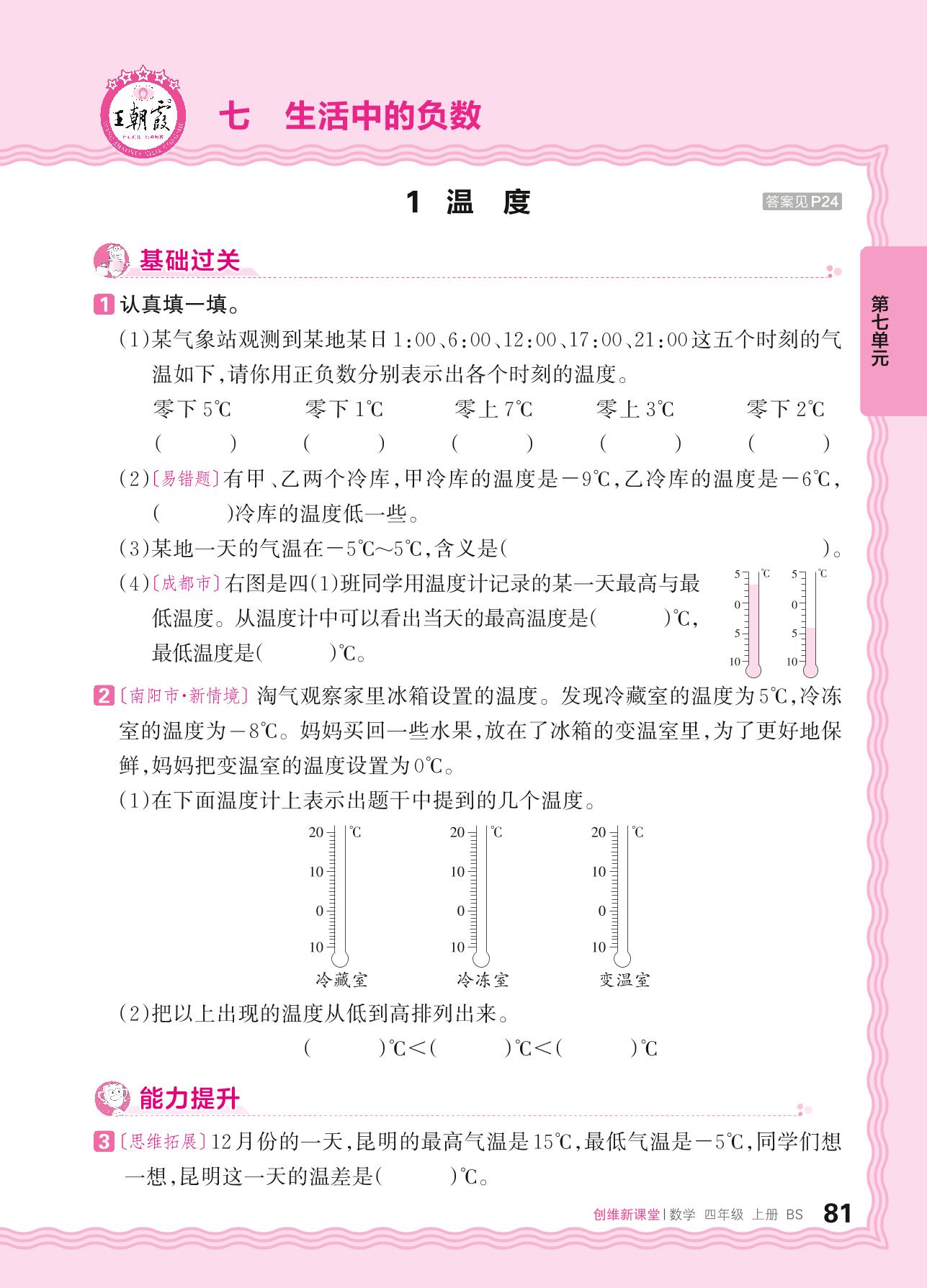 2024秋上册四年级数学北师版 第七单元 生活中的负数——1. 温度