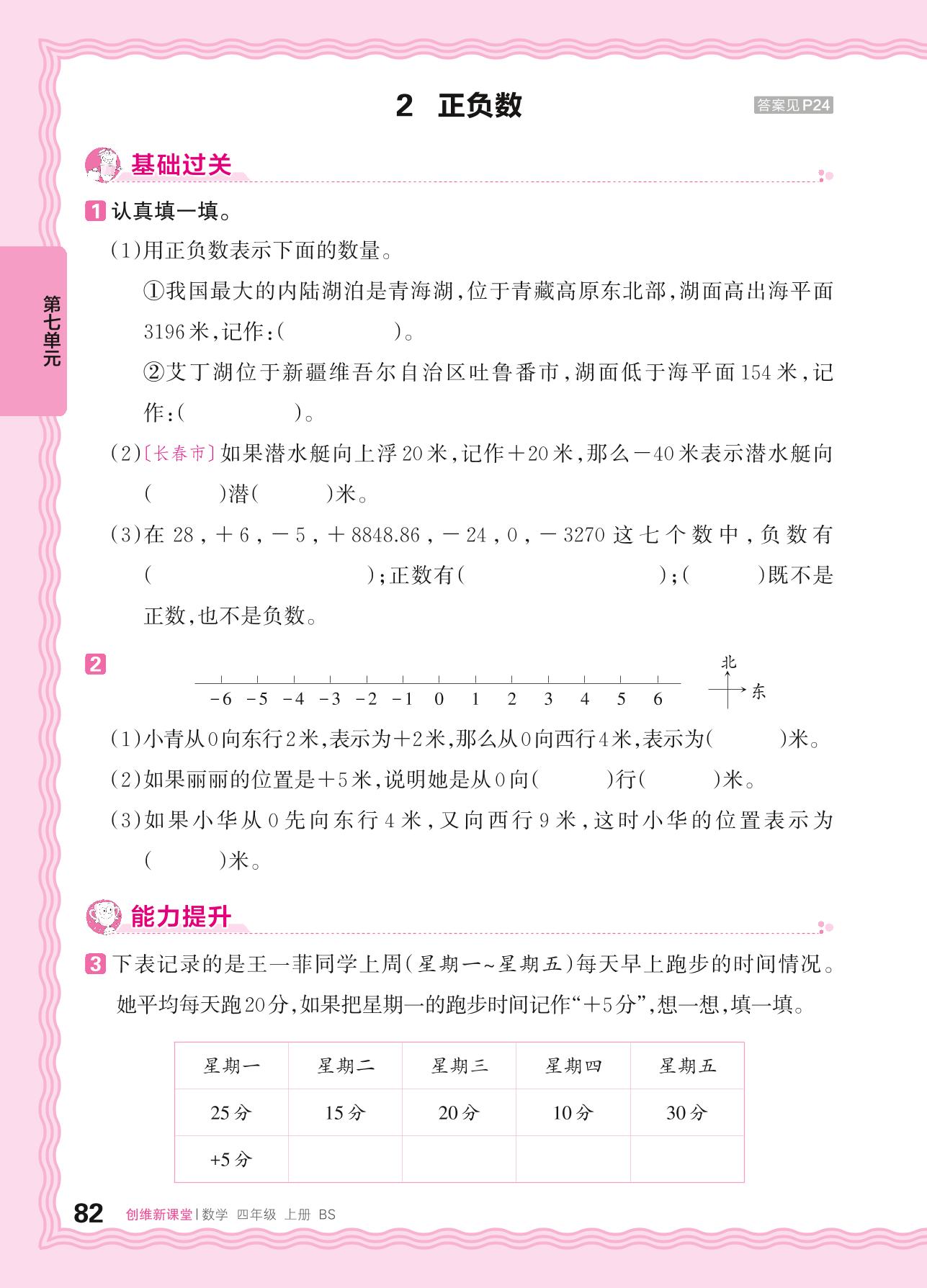 2024秋上册四年级数学北师版 第七单元 生活中的负数——2. 正负数