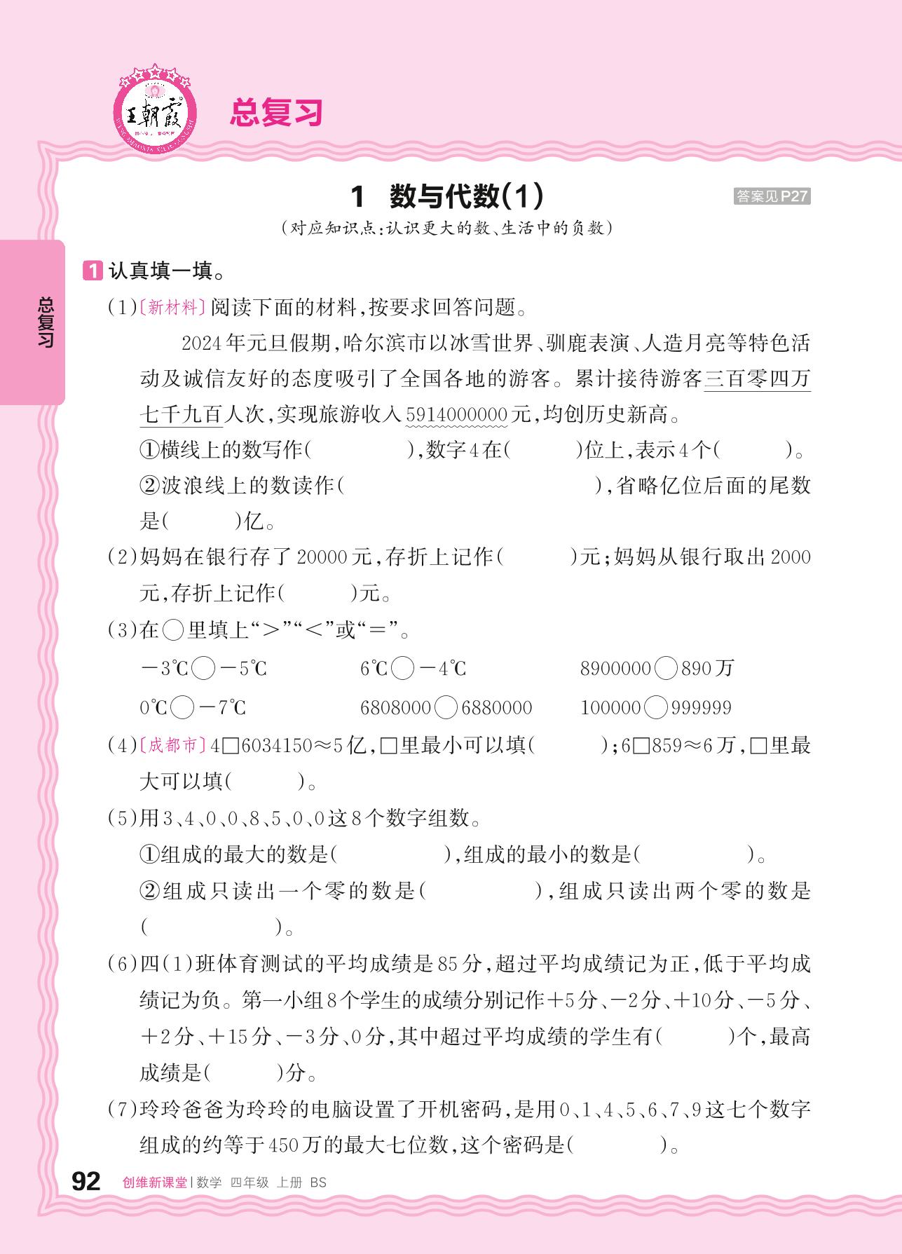 2024秋上册四年级数学北师版 总复习——1. 数与代数(1)